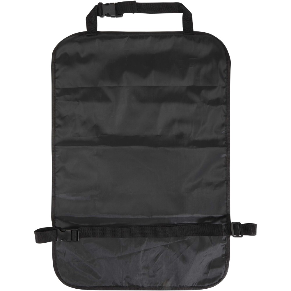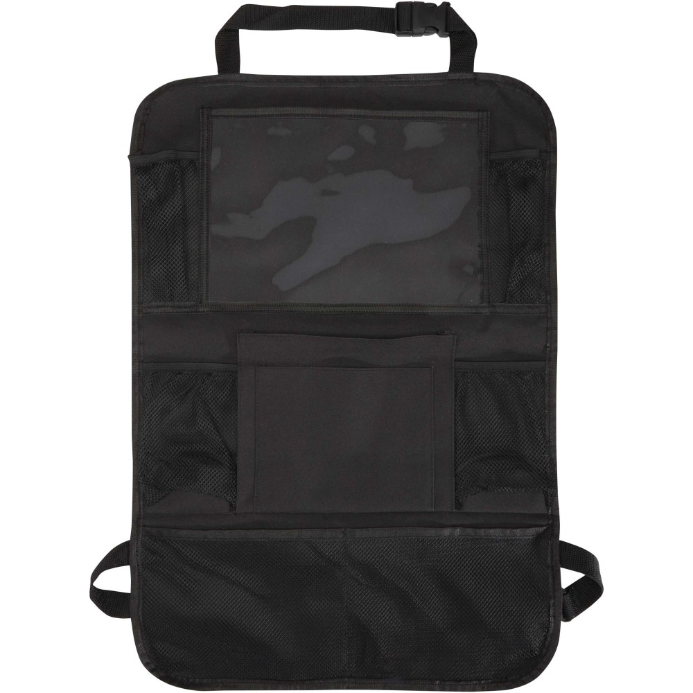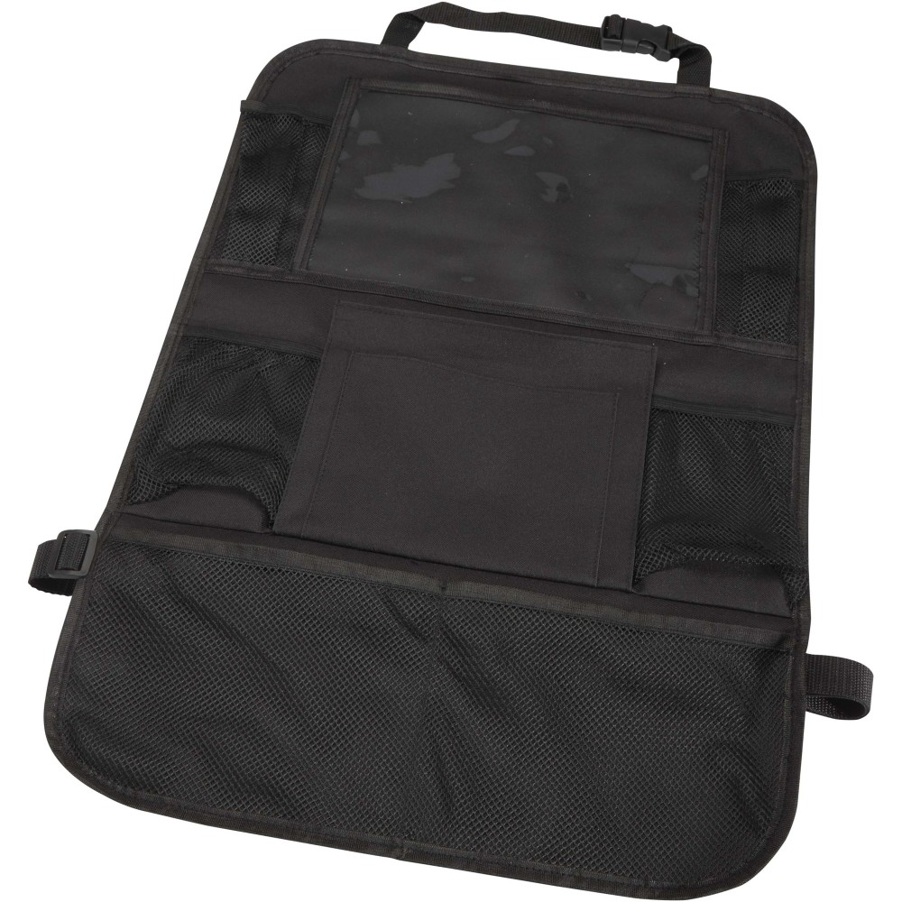 Car back seat organiser with multiple mesh pockets to hold essentials such as snacks, toys, or bottles, plus a PVC window for a tablet. It attaches easily to the front seat and helps keep your car tidy and clutter-free ? ideal for families, road trips, or everyday use. [ENG]