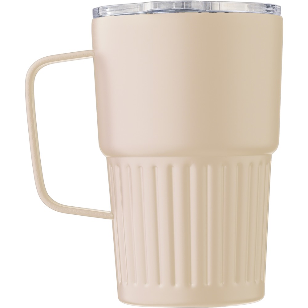 Recycled stainless steel double-walled drinking mug (450 ml). The interior is made of stainless steel 304 and the exterior is stainless steel 201 with a ridge grip and sturdy handle. Features an AS lid with a slide closure. Includes an engraved recycled logo on the body. Individually packaged in a brown cardboard box. [ENG] Logodruck: Mug-personalization, Gravur