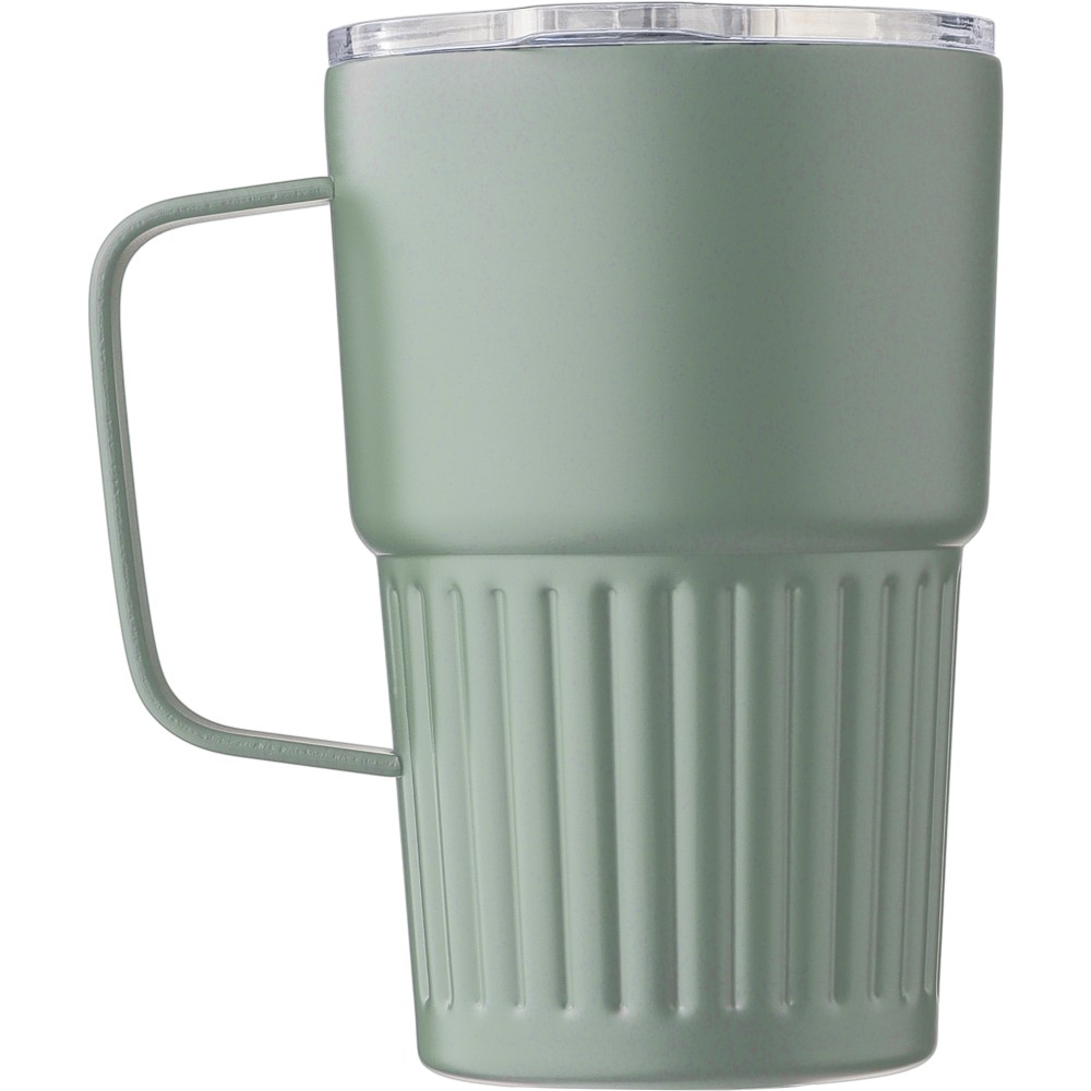 Recycled stainless steel double-walled drinking mug (450 ml). The interior is made of stainless steel 304 and the exterior is stainless steel 201 with a ridge grip and sturdy handle. Features an AS lid with a slide closure. Includes an engraved recycled logo on the body. Individually packaged in a brown cardboard box. [ENG] Logodruck: Mug-personalization, Gravur