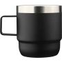 Recycled stainless steel cup (180 ml) with double-wall construction, ceramic inner coating, handle, and laser-engraved recycled stainless steel logo. Packed in a brown cardboard box. [ENG]