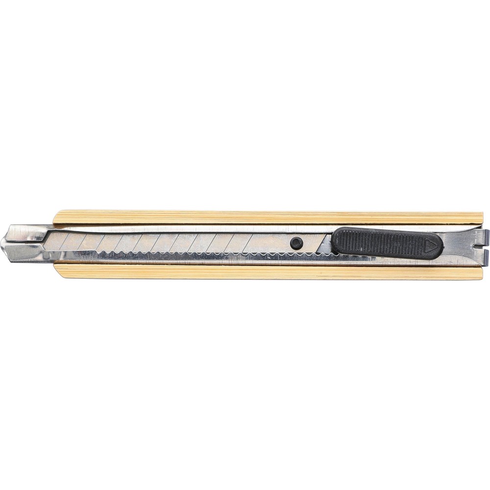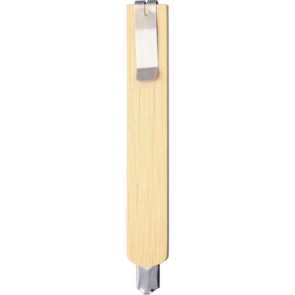 Metal cutter with a bamboo body. Features a metal clip on the back to attach the knife when not in use. The blades are made from carbon steel. Individually packaged in a recycled polybag. [ENG] Logodruck: Gravur