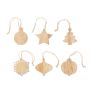Set of 6 beech wooden Christmas ornaments with jute cord. Designs: baubles, tree, and snowflake shaped hangers. Presented in a kraft box. [ENG] Logodruck: Gravur, Tampondruck