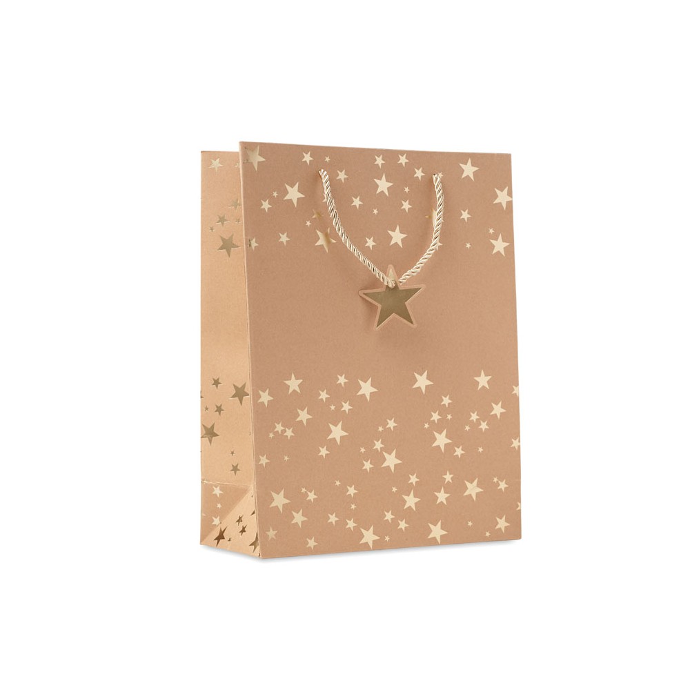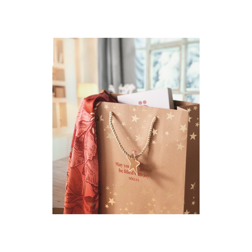 Elegant gift kraft paper bag with seasonal pattern. Gift tag included. 250 gr/m2 . This stylish and festive paper bag is the perfect packaging for a thoughtful gift for a special someone. Receiving a beautiful packaged gift is half the fun! FSC® -certified | FSC RECYCLED, P5.3, FSC-C213206 [ENG] Logodruck: Siebdruck, Tampondruck