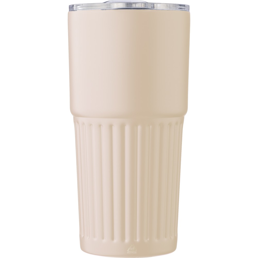 Recycled stainless steel double-walled drinking mug (500 ml). The interior is made of stainless steel 304 and the exterior is stainless steel 201 with a ridge grip design. Features an AS lid with a slide closure. Includes an engraved recycled logo on the body. Individually packaged in a brown cardboard box. [ENG] Logodruck: Körszita