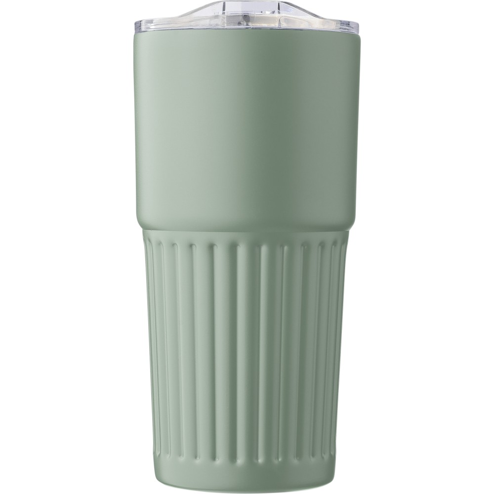 Recycled stainless steel double-walled drinking mug (500 ml). The interior is made of stainless steel 304 and the exterior is stainless steel 201 with a ridge grip design. Features an AS lid with a slide closure. Includes an engraved recycled logo on the body. Individually packaged in a brown cardboard box. [ENG] Logodruck: Körszita