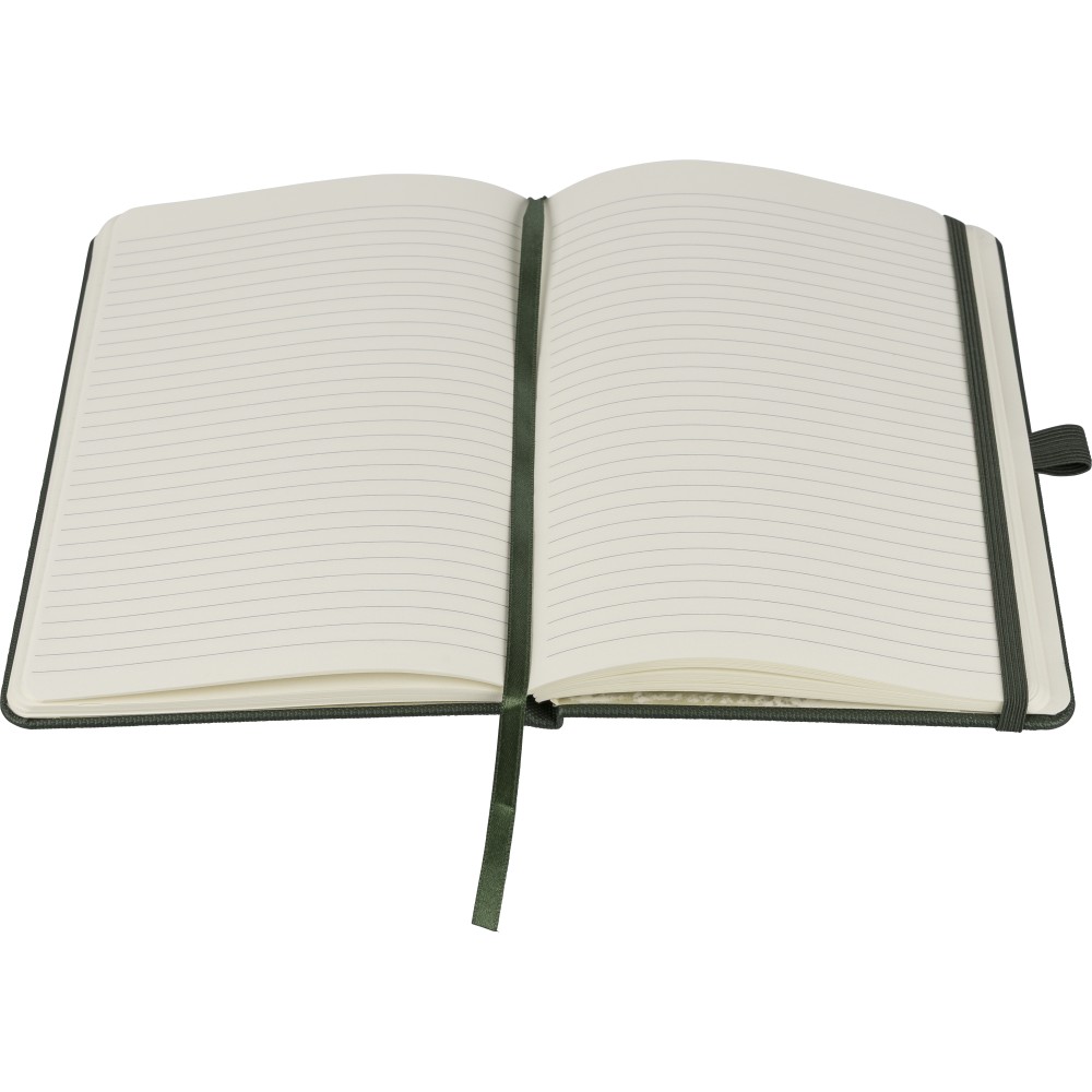 rPET 600D polyester notebook with PU coating, paper size A5. Contains 80 sheets of 70 gsm lined paper and features a ribbon bookmark, elastic band, and pen loop. Semi-hard cover design. Includes an embossed recycled logo on the backside. [ENG]