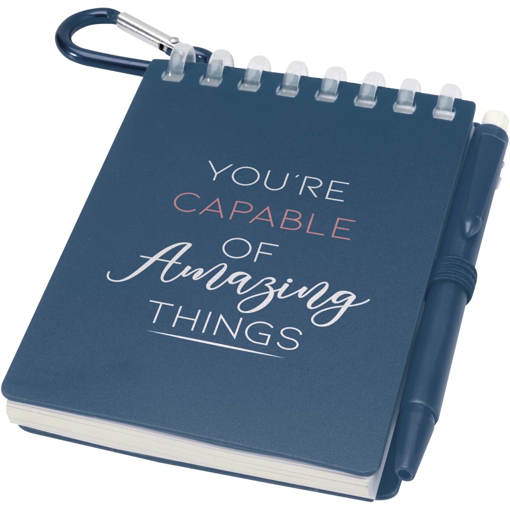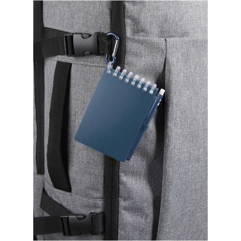 The Lig Mini notebook and pen set is a compact and practical companion for on-the-go note-taking. The spiral-bound notebook has a soft recycled plastic cover and 70 blank sheets of 120 g/m2 water-resistant stone paper, making it ideal for outdoor use. With rounded corners and a built-in pen loop, it embraces the mini-size trend while remaining functional. The matching ballpoint pen is made from recycled ABS plastic, writes in black ink, and offers a writing length of 250 metres. A colour-coordinated metal ring allows the set to be easily attached to a backpack, purse, or keychain, making it perfect for durable and portable note-taking. Notebook size: 11 × 7.5 cm. [ENG]