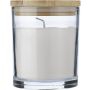 Glass candle with 120 grams of colored wax and a vanilla scent, housed in a transparent glass container with a bamboo lid. Provides approximately 20 hours of burning time. Individually packaged in a white carton tube. [ENG]