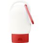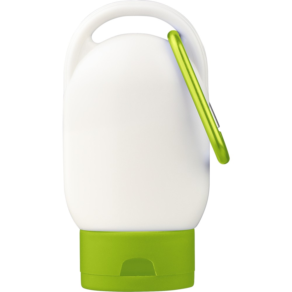 Sunscreen lotion with SPF30 in a 30 ml tube. Features a colored cap and matching carabiner for easy attachment. Backside includes ingredient list and best-before date. Shelf life of 2 years. [ENG]
