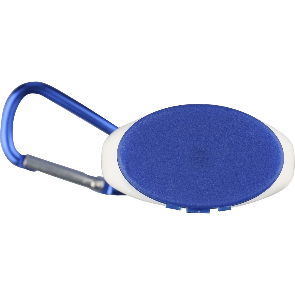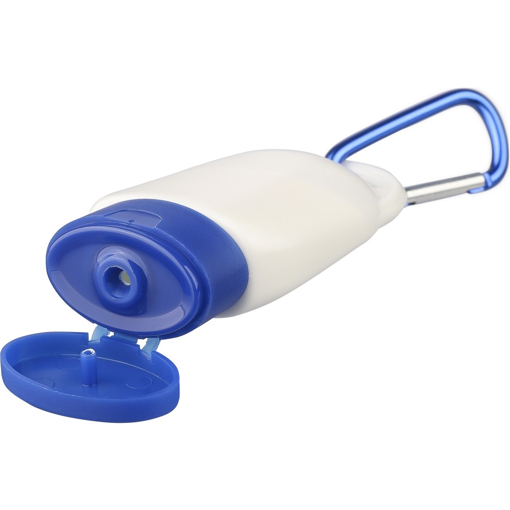 Sunscreen lotion with SPF30 in a 30 ml tube. Features a colored cap and matching carabiner for easy attachment. Backside includes ingredient list and best-before date. Shelf life of 2 years. [ENG]