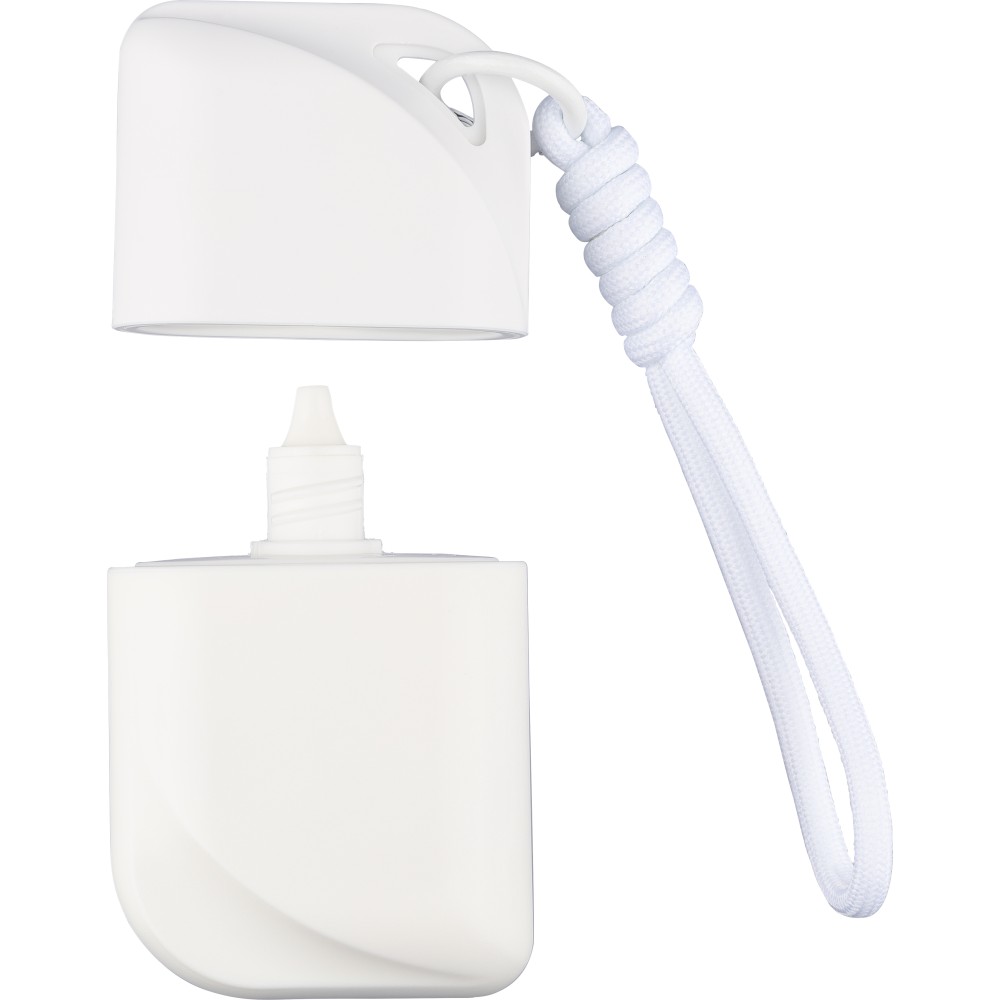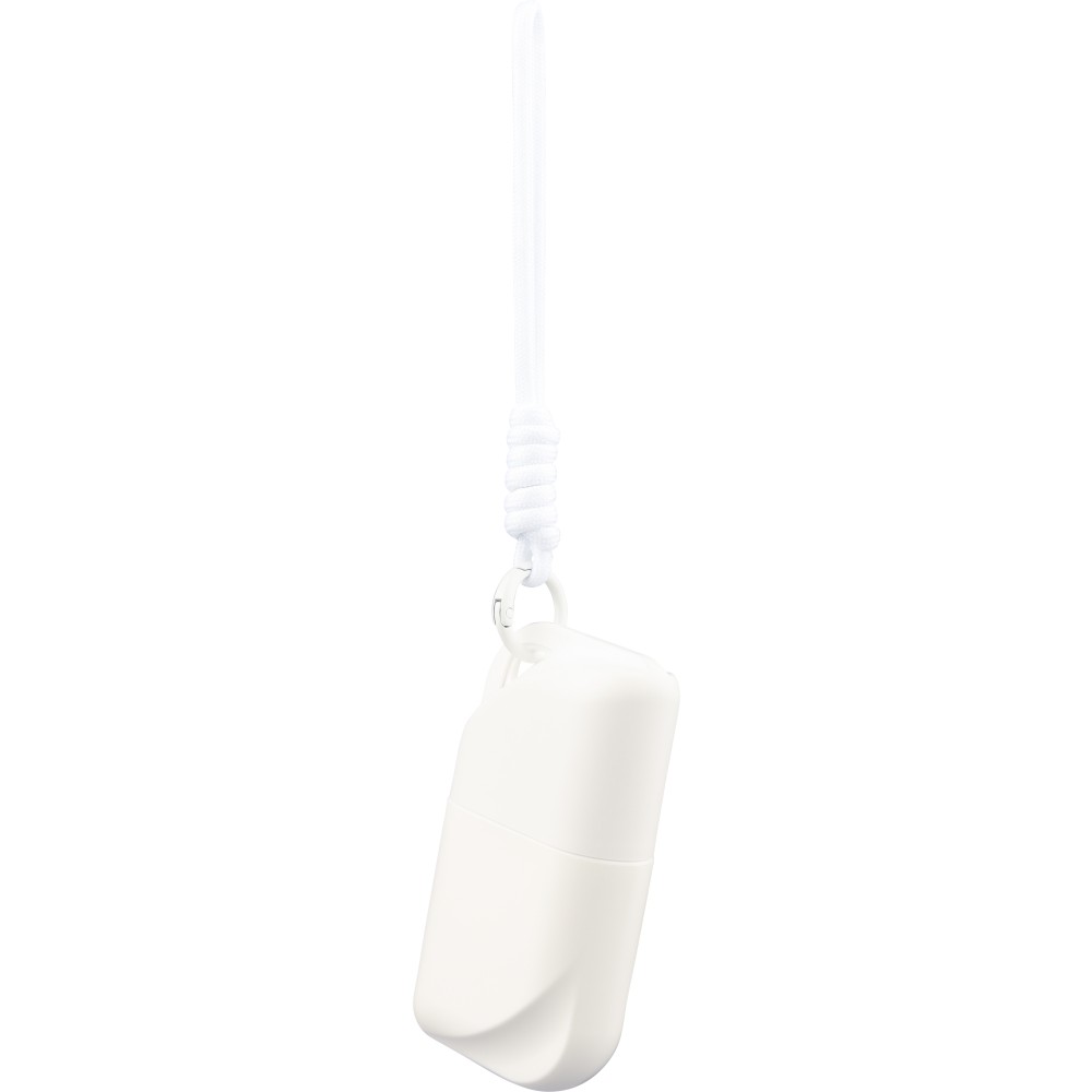 PP cassette with 50 ml sunscreen lotion (SPF50) and matching color polyester wrist cord with metal hook. Features a booklet sticker on the backside. [ENG]