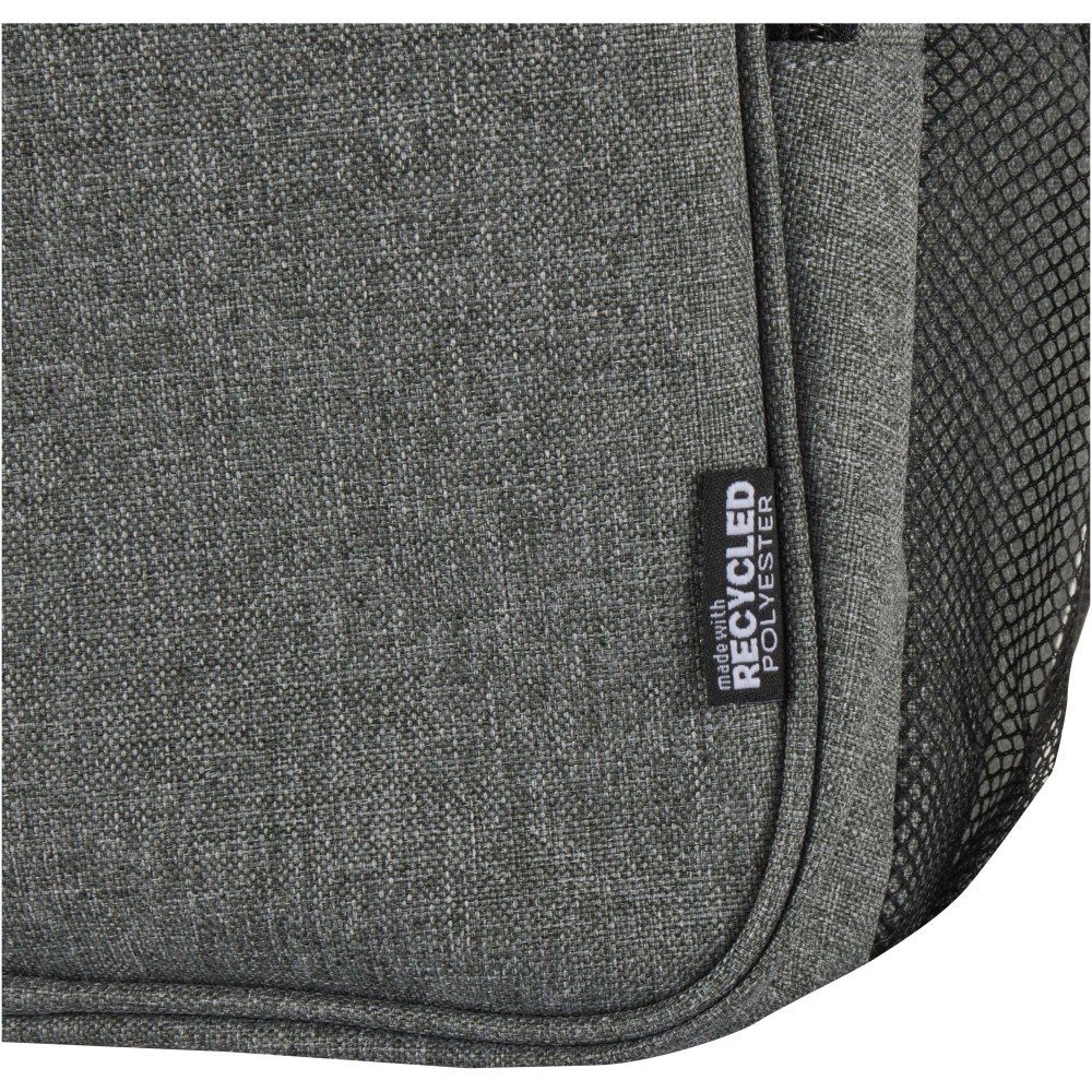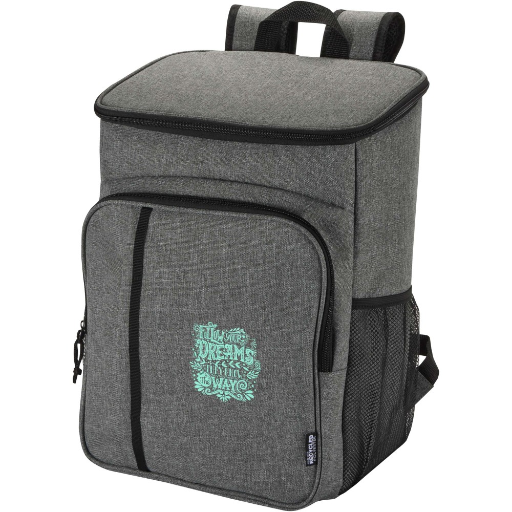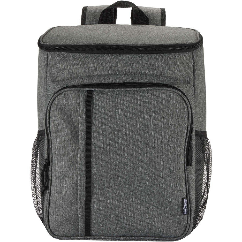 The Tundra picnic cooler backpack is made from GRS certified recycled materials and comes with a reusable two-person cutlery set made from food-grade plastic. Its leak-proof main compartment, insulated with high-density foam and a heat-sealed PEVA lining, keeps food and drinks chilled for hours. For added convenience, it includes two side mesh pockets, a zipped front pocket with tableware (two knives, two forks, two cups, and two plates), and an extra zipped pocket on top. Padded adjustable shoulder straps and a sturdy webbing handle make it comfortable to carry, making this backpack an ideal companion for picnics, outdoor dining, camping, or beach trips. Volume capacity: 20 litres. [ENG]