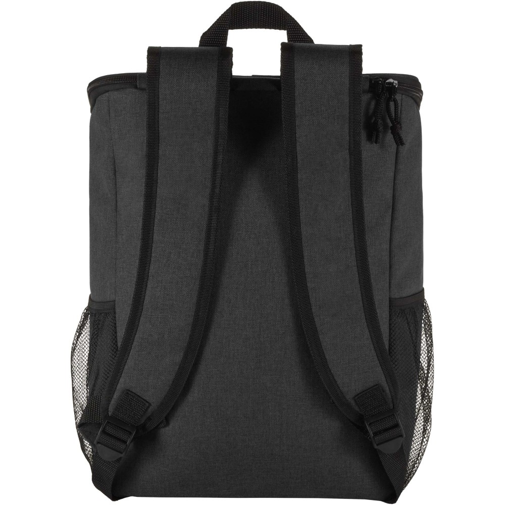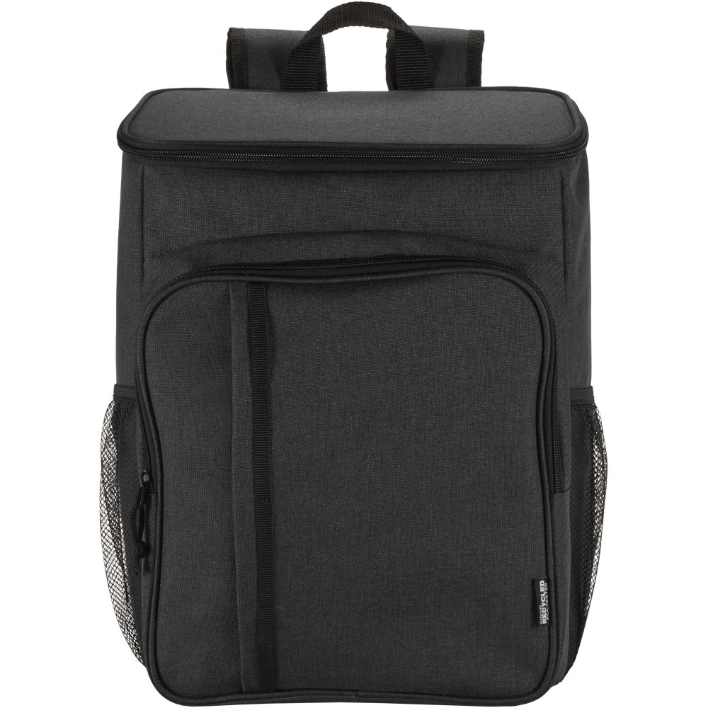 The Tundra picnic cooler backpack is made from GRS certified recycled materials and comes with a reusable two-person cutlery set made from food-grade plastic. Its leak-proof main compartment, insulated with high-density foam and a heat-sealed PEVA lining, keeps food and drinks chilled for hours. For added convenience, it includes two side mesh pockets, a zipped front pocket with tableware (two knives, two forks, two cups, and two plates), and an extra zipped pocket on top. Padded adjustable shoulder straps and a sturdy webbing handle make it comfortable to carry, making this backpack an ideal companion for picnics, outdoor dining, camping, or beach trips. Volume capacity: 20 litres. [ENG]