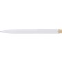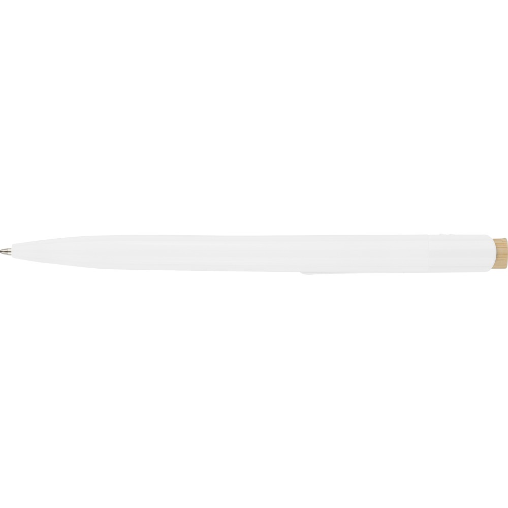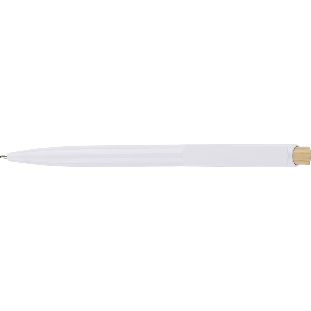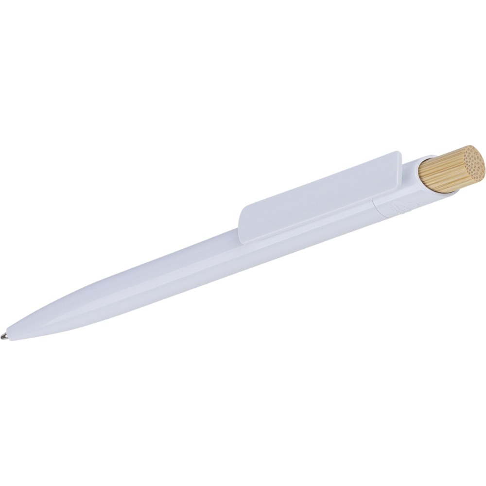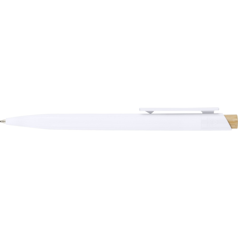 Recycled ABS ballpen with bamboo push button and white clip, suitable for digital printing. Features a recycled logo in the in-mould. Approximate writing length of 600 metres. Blue ink. [ENG]