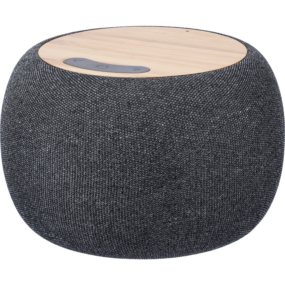 Bamboo and recycled ABS speaker with fabric details around the speaker. 5W output, DC 5V input, 1200mAh built-in rechargeable battery, with 6 hours of playing time. Working distance of 15-20 meters, signal-to-noise ratio of 87 dB. Frequency range: 100 Hz to 20 kHz. Includes 50 cm Type-C charging cable. Wireless connection technology: 5.2. Individually packaged in a brown cardboard box. [ENG] Logodruck: Gravur, Tampondruck