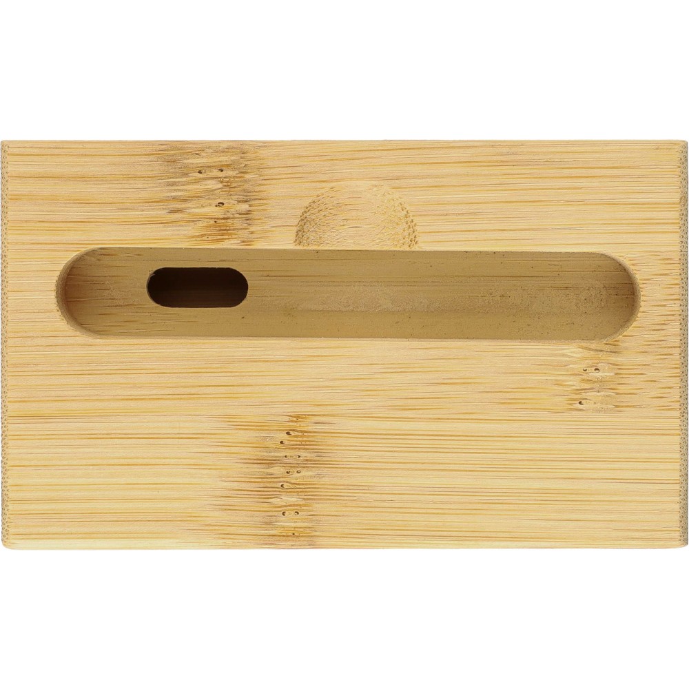 Bamboo phone stand with sound amplifier function. When playing music, the sound is amplified through the bottom without the need for power or batteries. Phone slot dimensions: approx. 8.2 x 1.2 cm. Individually packaged in a brown cardboard box. [ENG] Logodruck: Gravur, Tampondruck
