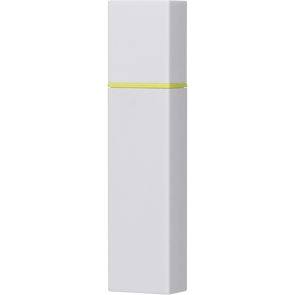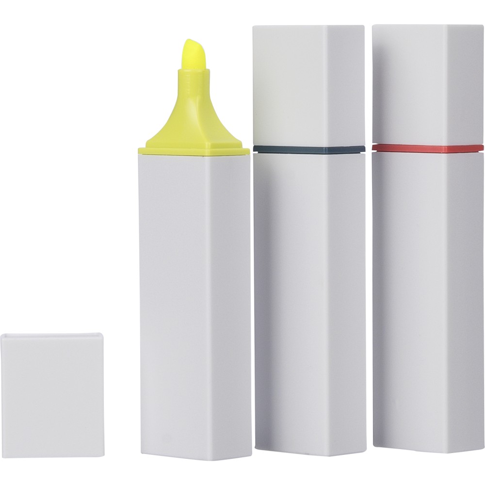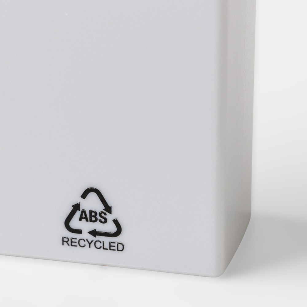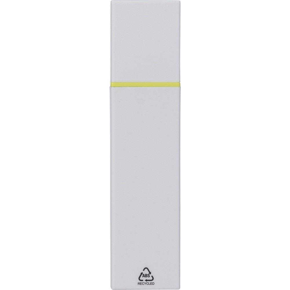 Recycled ABS text marker with white body and colored detail. Features a click closure and includes a 2-year warranty against drying out. Marked with the Recycled ABS logo. [ENG]