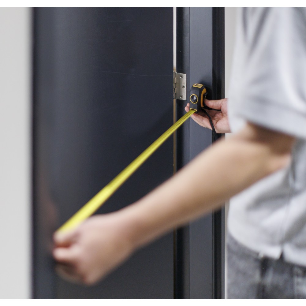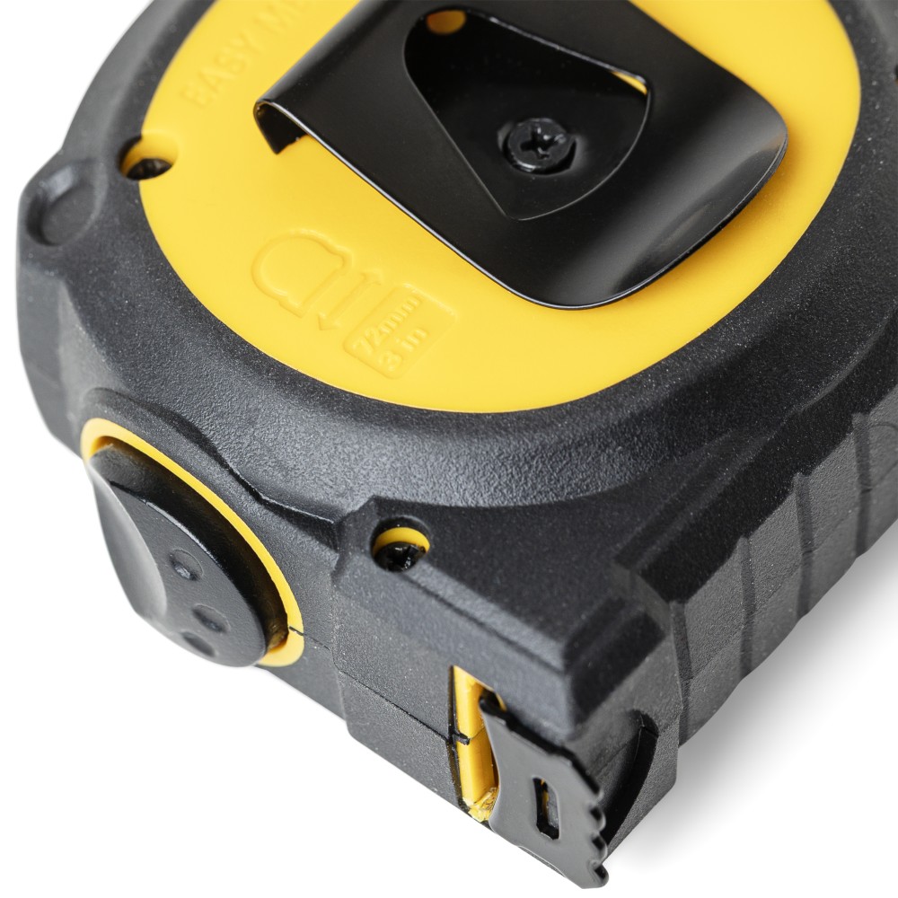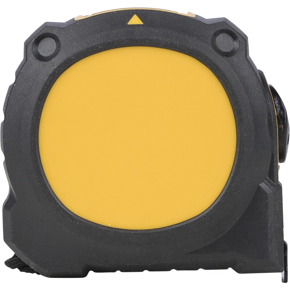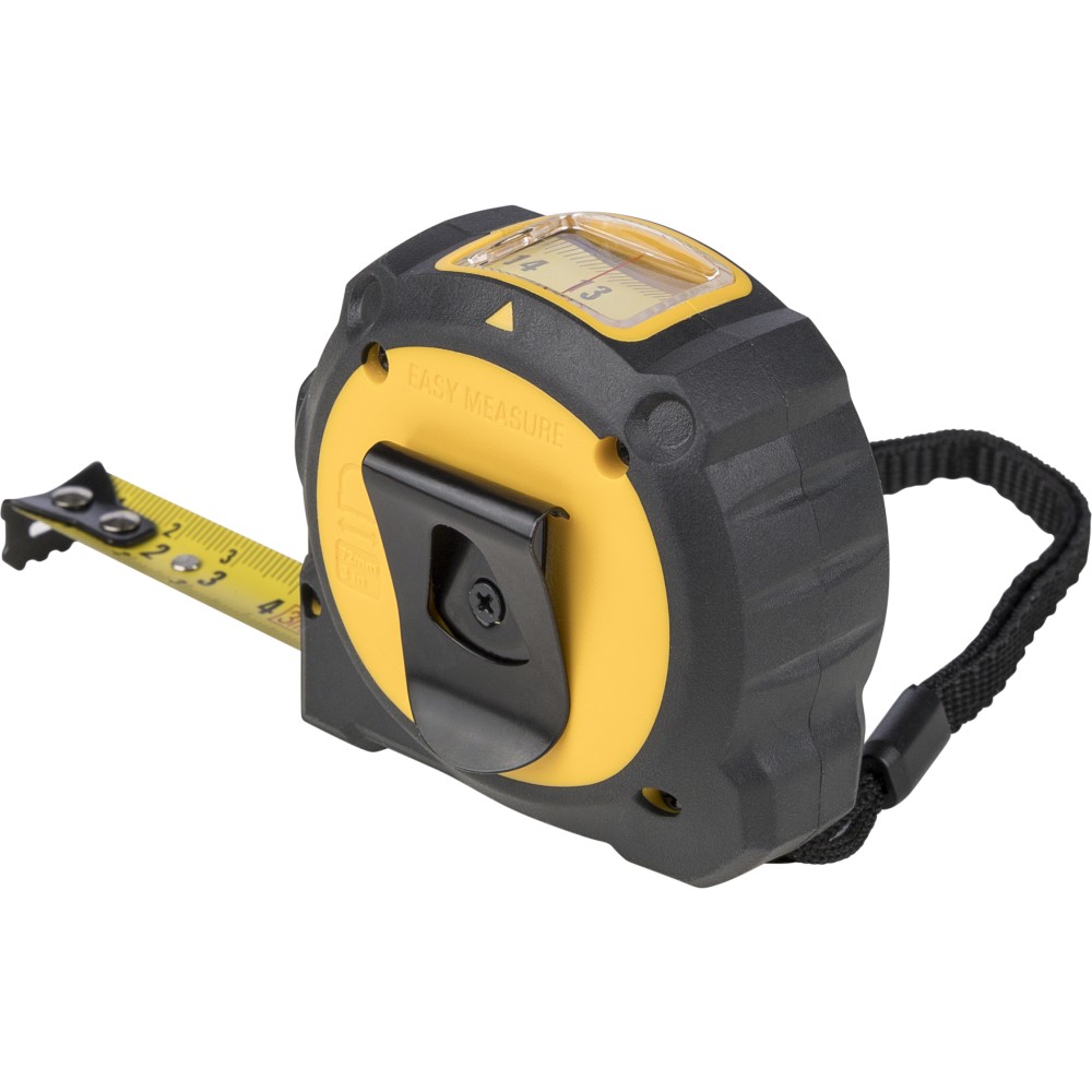 ABS and TPR tape measure with 3 m long, 16 mm wide double-sided metal tape. Transparent top window for precise inside measurements. Includes lock/release function, back clip, and polyester wrist strap. Packed in brown carton box with illustration. [ENG]