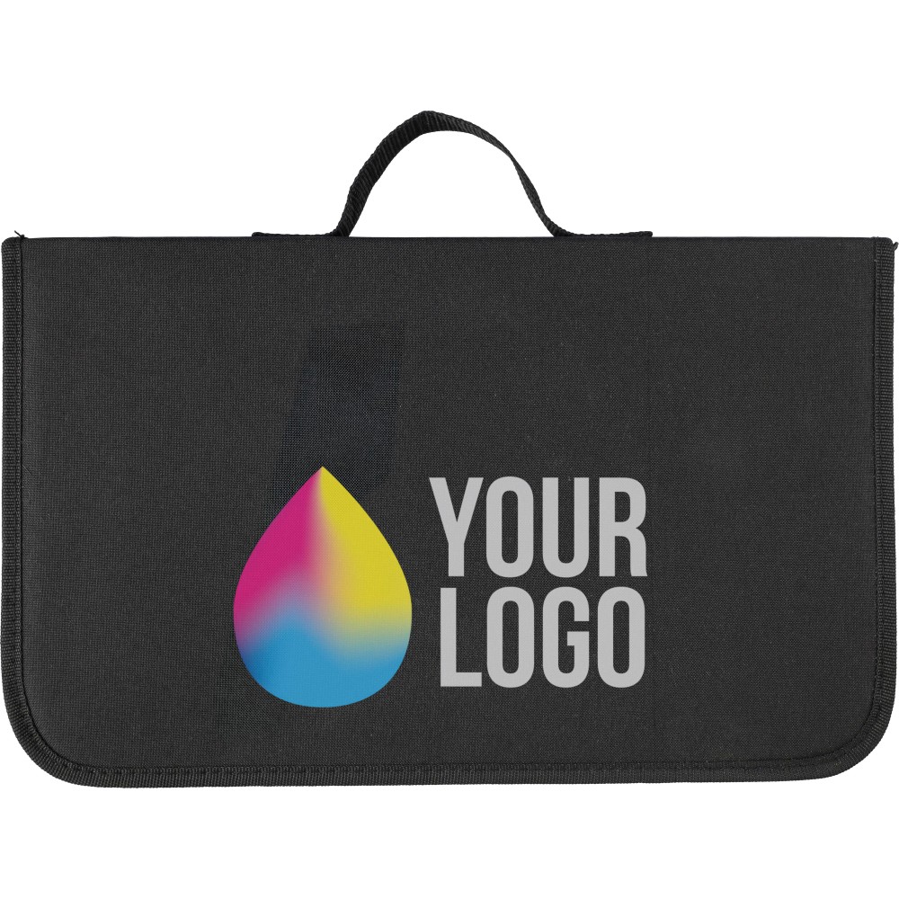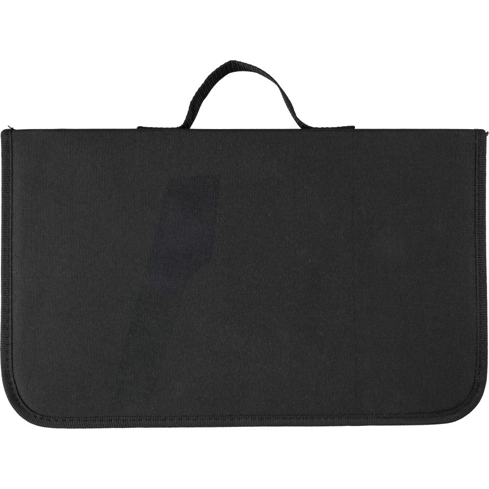 Stainless steel barbecue set with wooden handles. Tools include a knife, fork, tongs, and a wooden cutting board. Packaged in a 300D polyester zippered pouch with a front pocket. [ENG] Logodruck: Gravur, Siebdruck
