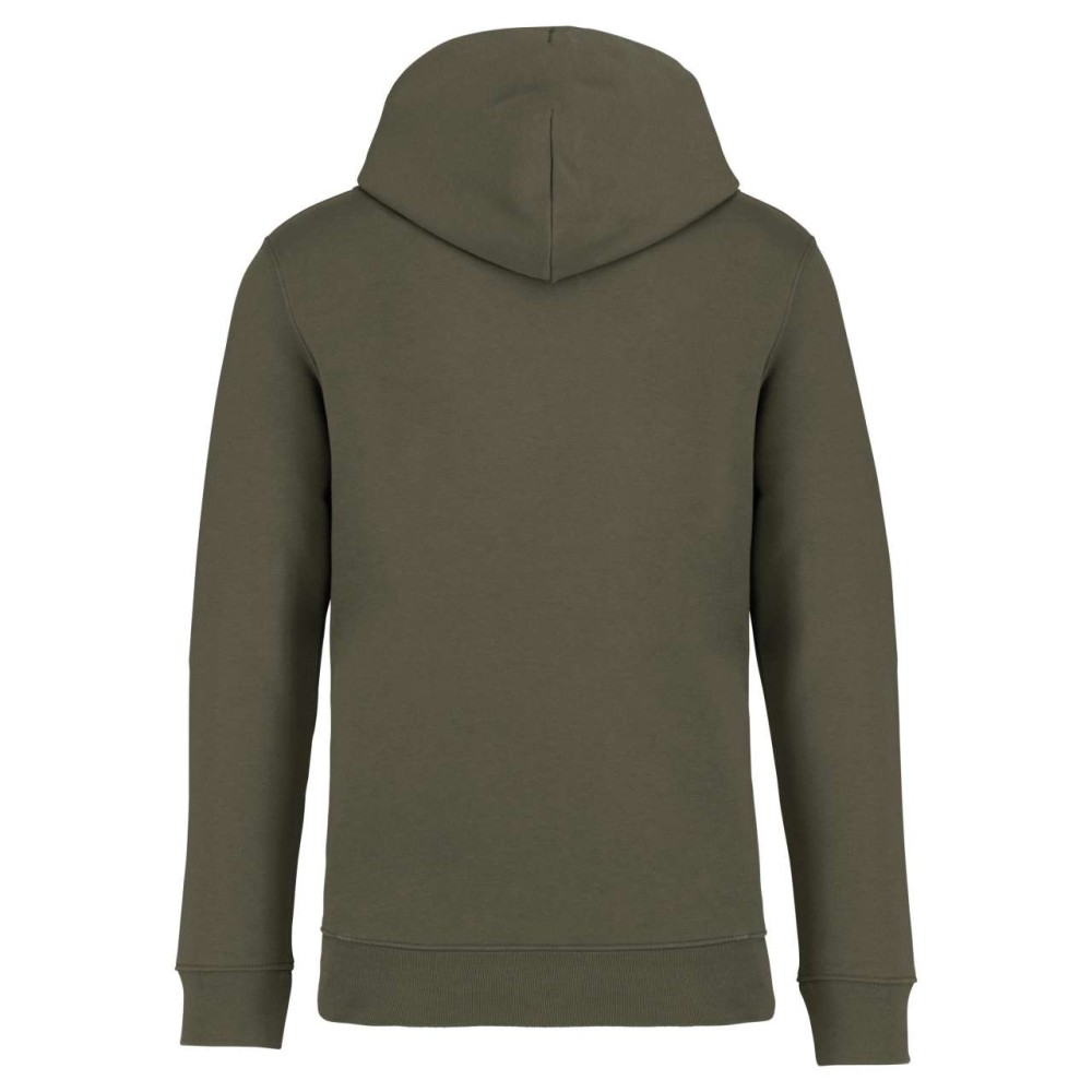 85 % organic cotton / 15 % post-consumer recycled polyester. Ringspun combed cotton. Straight fit. 3-ply brushed fleece, LSF (Low Shrinkage Fleece: pre-shrunk fleece). 1/2 circle in the back. Kangaroo pocket. 1 x 1 rib bottom hem and cuffs. Double overstitching on cuffs, armholes, bottom hem and 1/2 circle. Taped neck inside at the back. Lined hood in main material with drawstring tie-off. Round drawstring with recycled metal tips and eyelets. [ENG] Logodruck: Stickerei, Siebdruck