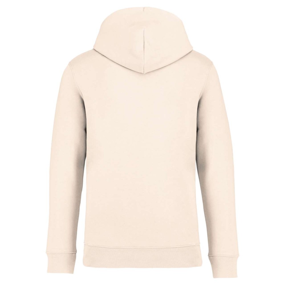 85 % organic cotton / 15 % post-consumer recycled polyester. Ringspun combed cotton. Straight fit. 3-ply brushed fleece, LSF (Low Shrinkage Fleece: pre-shrunk fleece). 1/2 circle in the back. Kangaroo pocket. 1 x 1 rib bottom hem and cuffs. Double overstitching on cuffs, armholes, bottom hem and 1/2 circle. Taped neck inside at the back. Lined hood in main material with drawstring tie-off. Round drawstring with recycled metal tips and eyelets. [ENG] Logodruck: Stickerei, Siebdruck