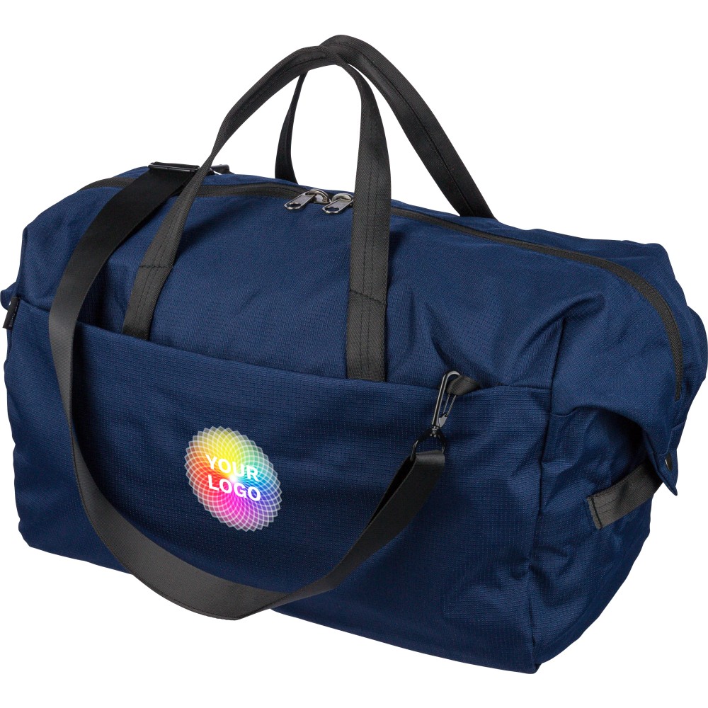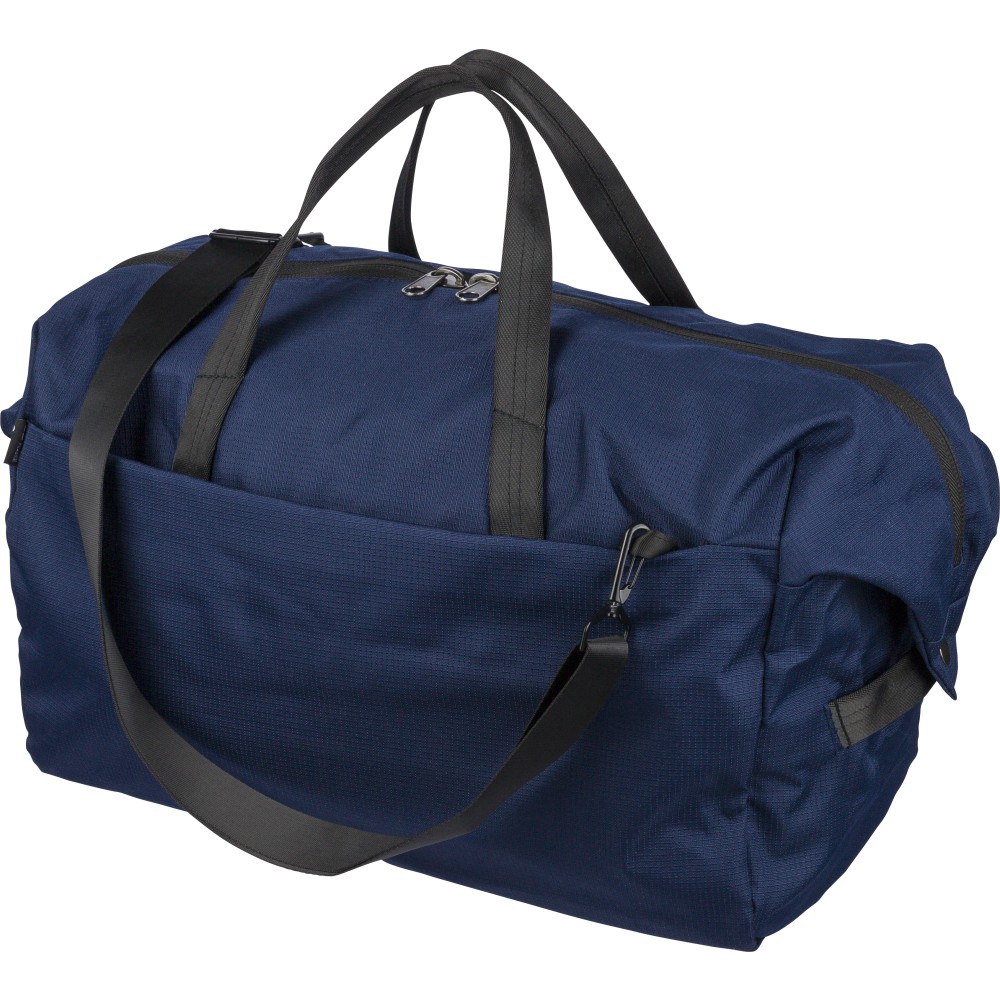 rPET 300D Ocean Bound sports bag made from recycled ocean plastic with a durable, textured finish. 33.7 l capacity with large main compartment, front and inner zippered pockets. Features two sturdy handles, adjustable shoulder strap, and Ocean Bound Plastic label. [ENG] Logodruck: Siebdruck