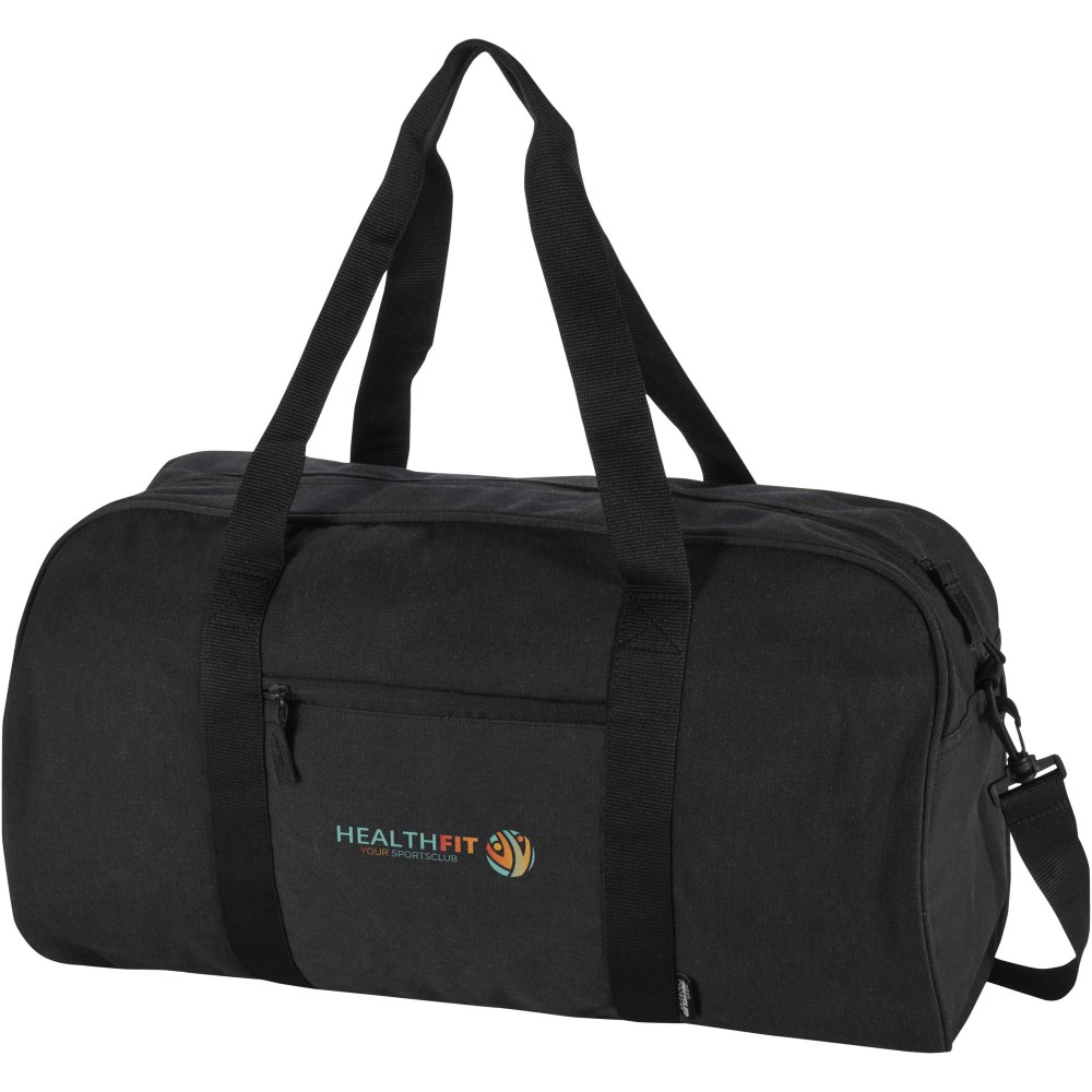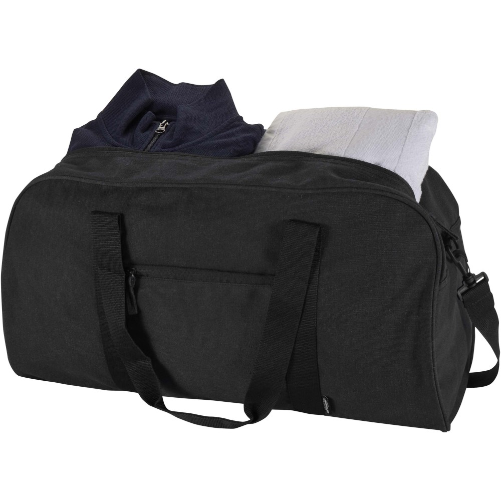 Made from GRS certified recycled water-repellent canvas, the Recanvas duffel bag combines durability with everyday versatility. It features a spacious main compartment, a zipped front pocket for quick-access items, soft carry handles, and detachable adjustable shoulder straps for flexible carrying options. Perfect for gym sessions, weekend trips, or daily use. Volume capacity: 40 litres. [ENG] Logodruck: Siebdruck