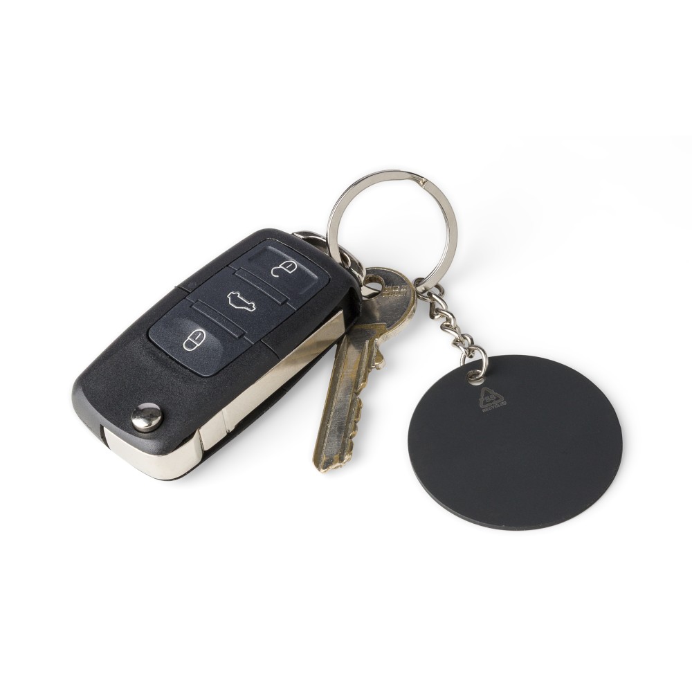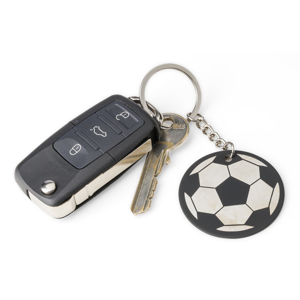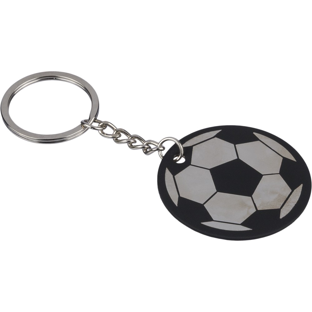 Recycled stainless steel rubberized keychain with metal ring in a round soccer ball design. Features an engraved recycled logo that reveals a shiny mirror effect after engraving. Individually packed in a kraft paper envelope. [ENG]