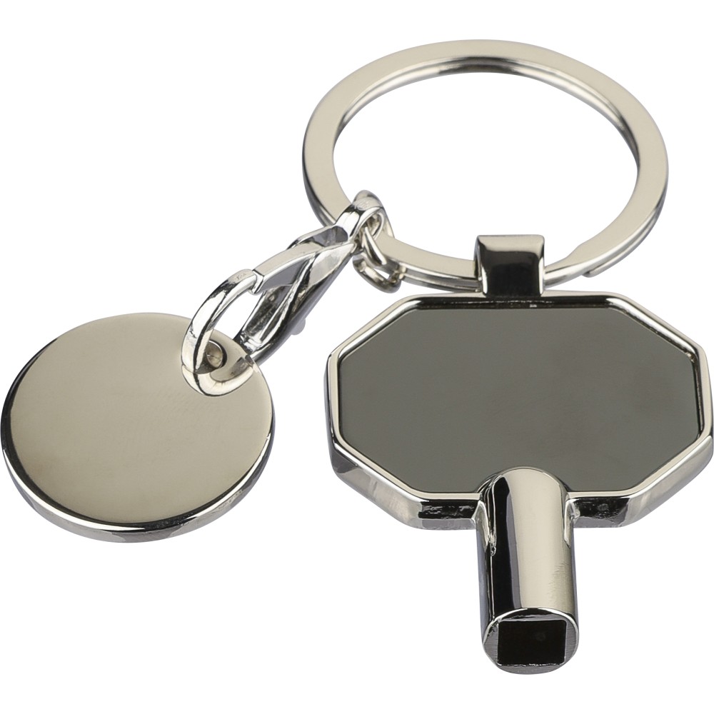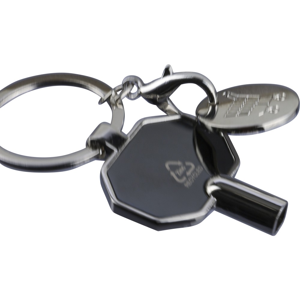 Recycled zinc alloy radiator bleed keychain with shopping coin. Includes 5×5 mm square key, standard in Europe for radiator bleeding. Comes with sturdy metal keyring and recycled logo. Packed in a brown carton envelope with illustration. [ENG]