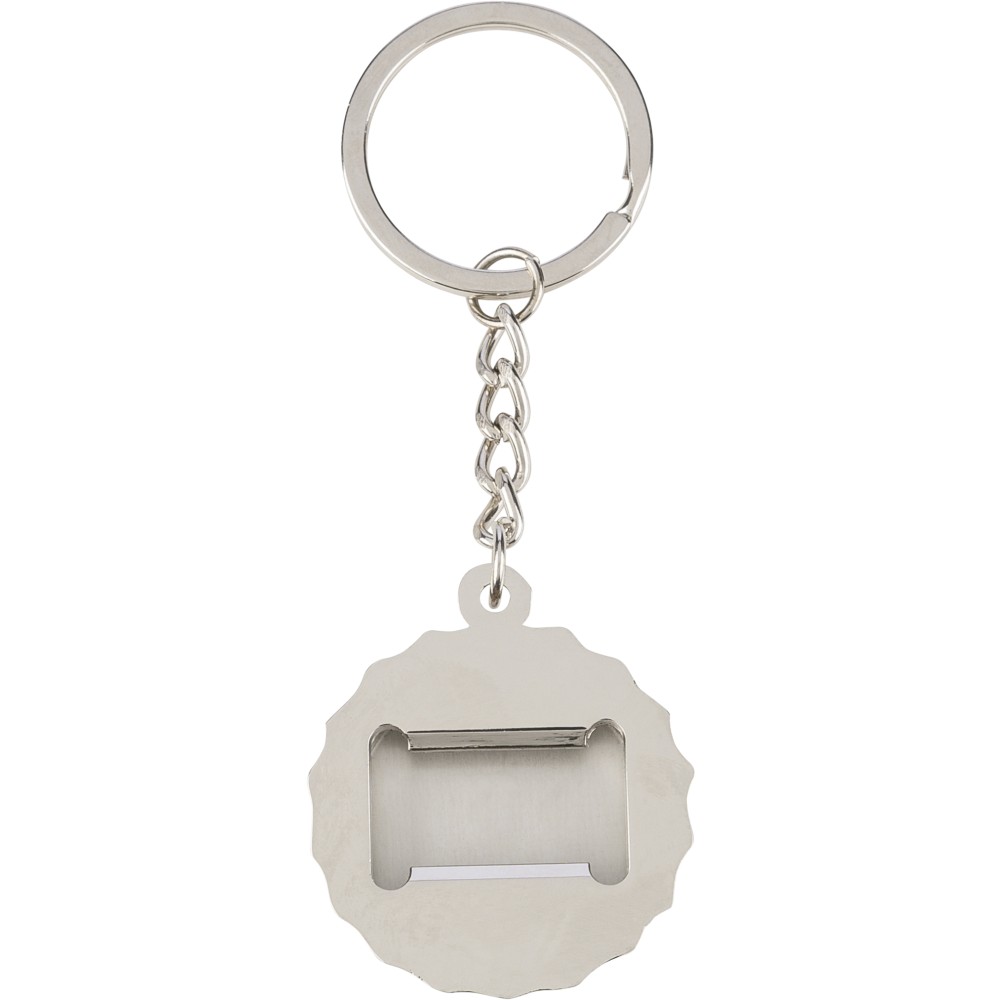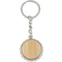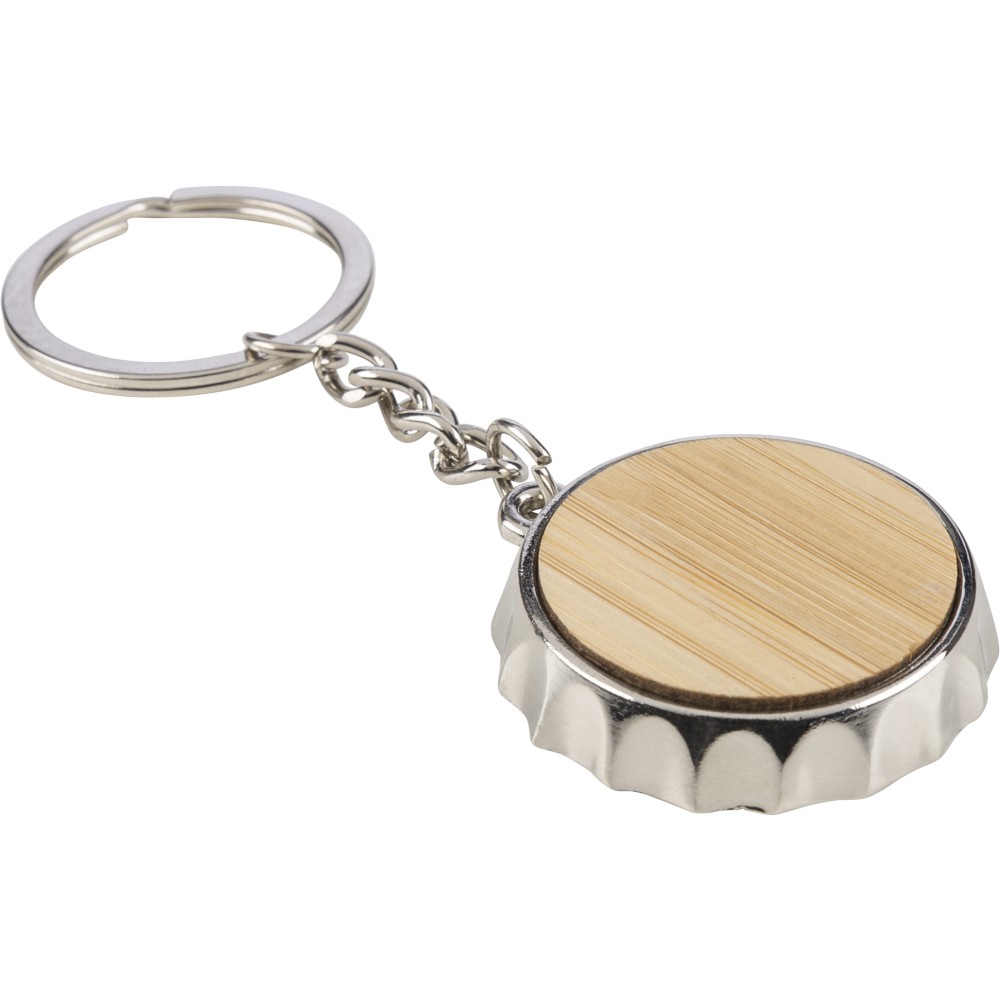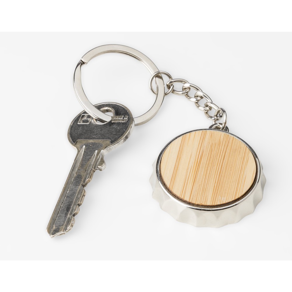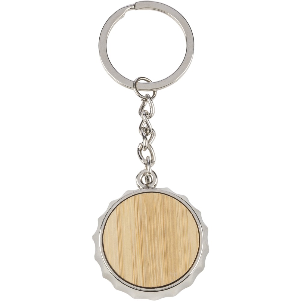 Zinc alloy keychain with bamboo inlay on the front and integrated bottle opener on the back. Features a metal keyring and is packaged in a paper bag. [ENG]