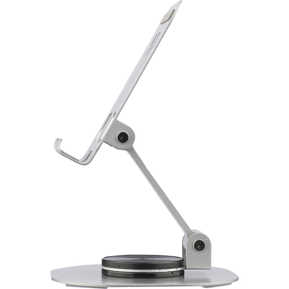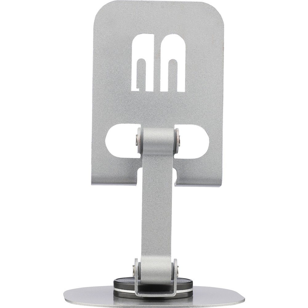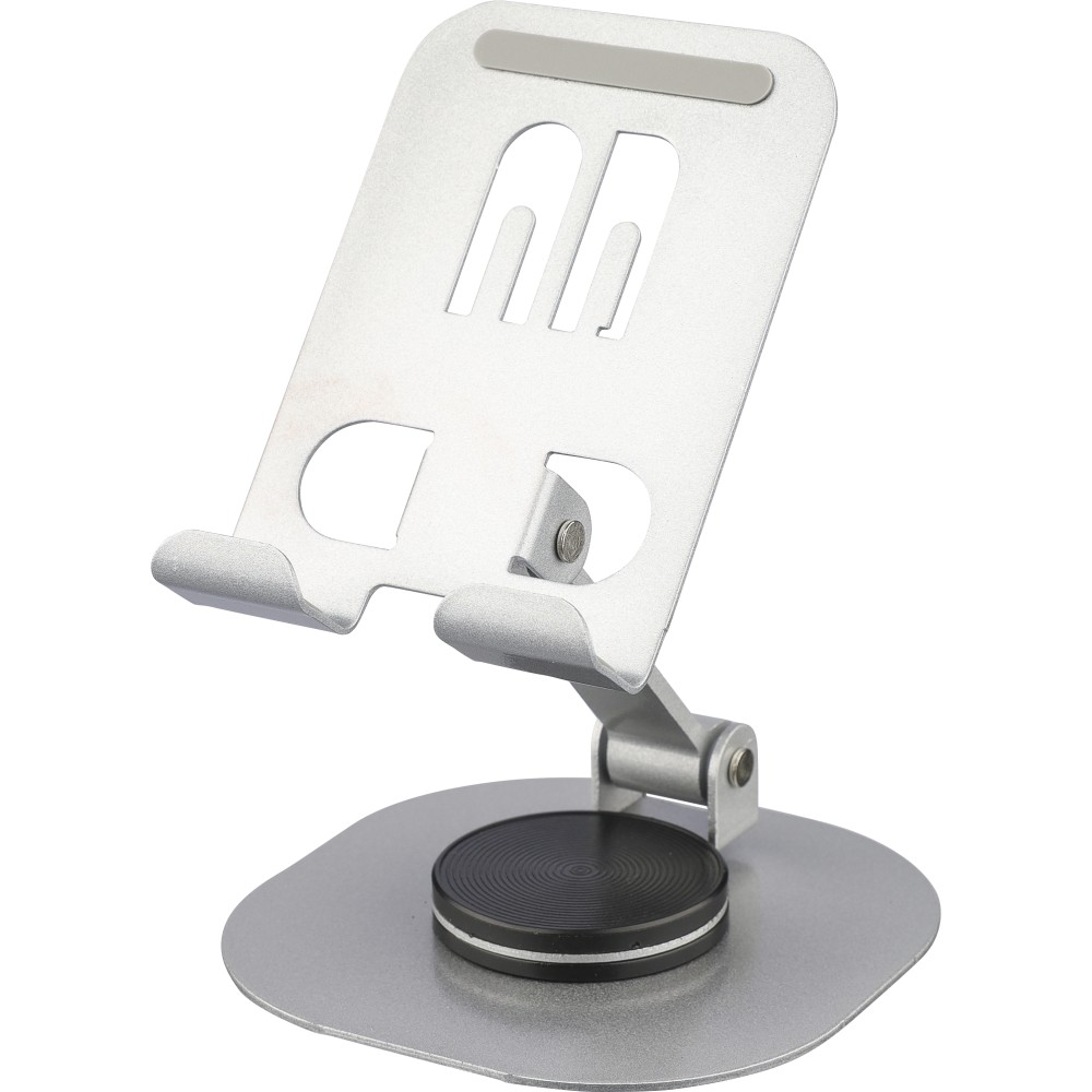 Aluminium alloy phone stand with 360-degree rotation function. Can be fully folded flat for easy storage. Sturdy and weighty design for stable support. Individually packaged in a white box. [ENG]