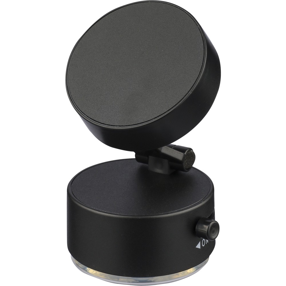 Recycled ABS MagSafe phone stand with suction cup base and lock function for secure use on smooth surfaces. Foldable design with metal ring for universal phone compatibility. Recycled logo between on/off. Packed in a brown cardboard box. [ENG]