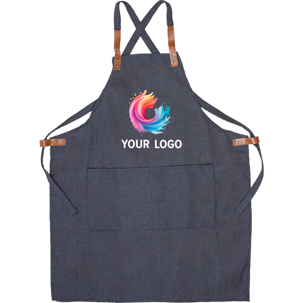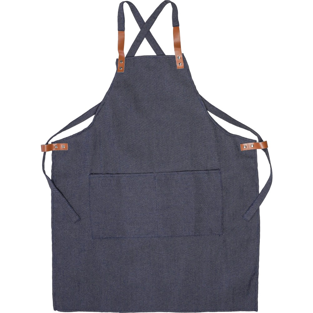 Denim (280 gsm) apron with shoulder straps and two front pockets. The denim is made from 65% polyester and 35% cotton. This apron does not have a neck strap, only shoulder straps. Denim color fastness is up to 2-3 levels. Individually packaged in a brown cardboard gift box. [ENG] Logodruck: Stickerei, Siebdruck