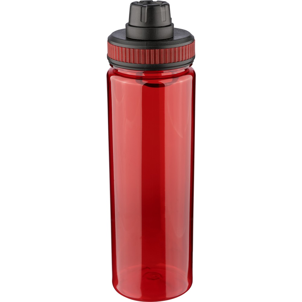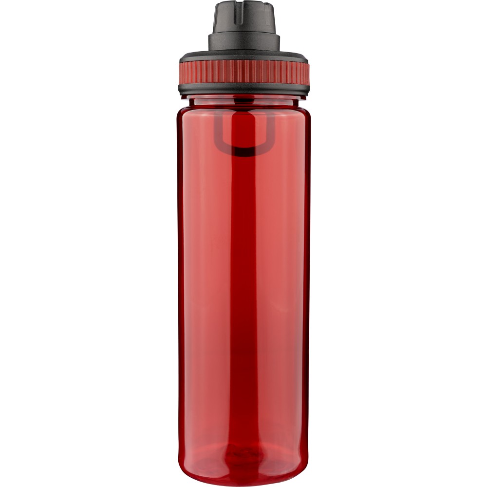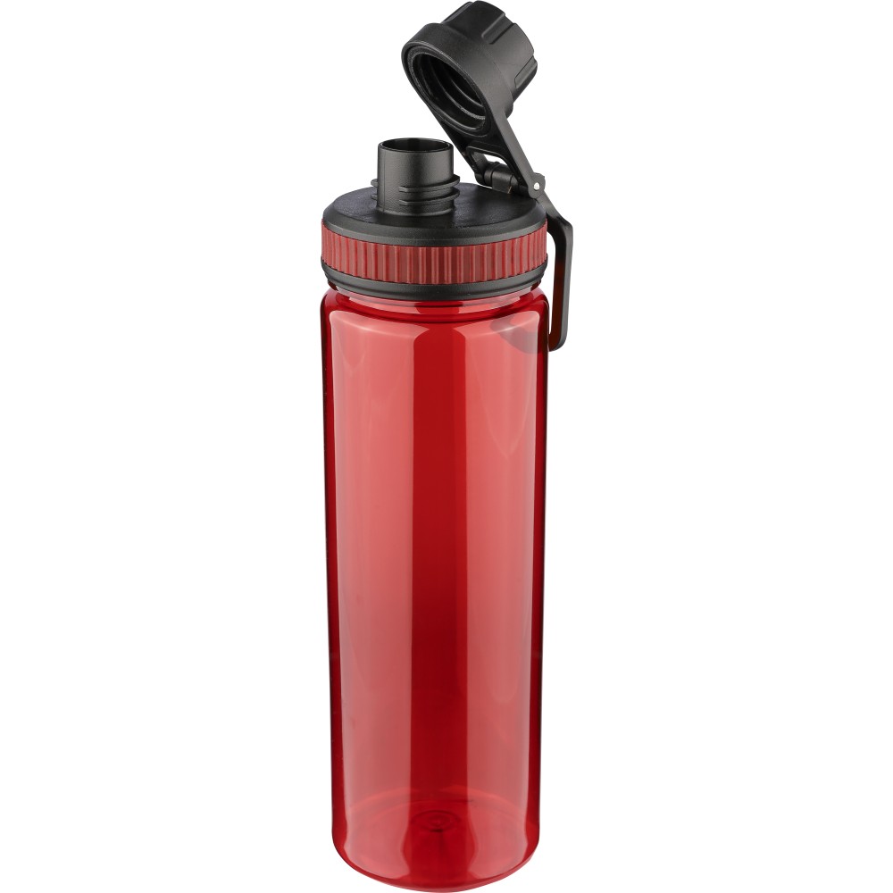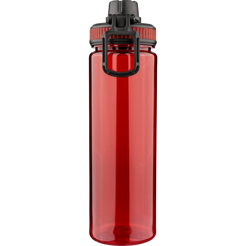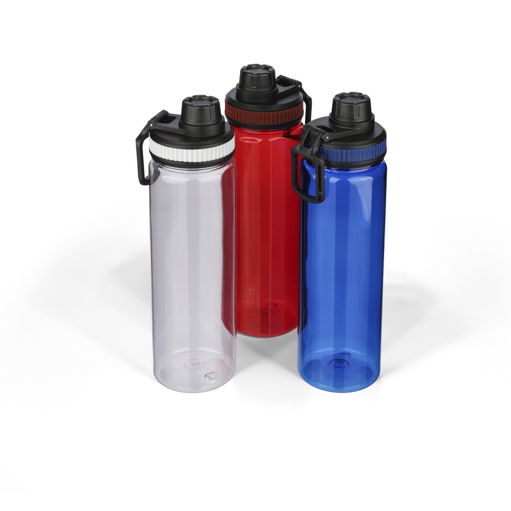 rPET drinking bottle (750 ml) with PP lid featuring a carrying handle and screw cap. Includes a colored silicone detail in the lid, matched to the transparent bottle body. [ENG]