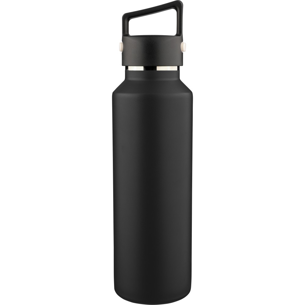 Recycled stainless steel vacuum bottle (600 ml) with double-wall construction, PP lid with carry loop, dual push-button lid opening, and laser-engraved recycled logo. Packed in a brown cardboard box. [ENG]