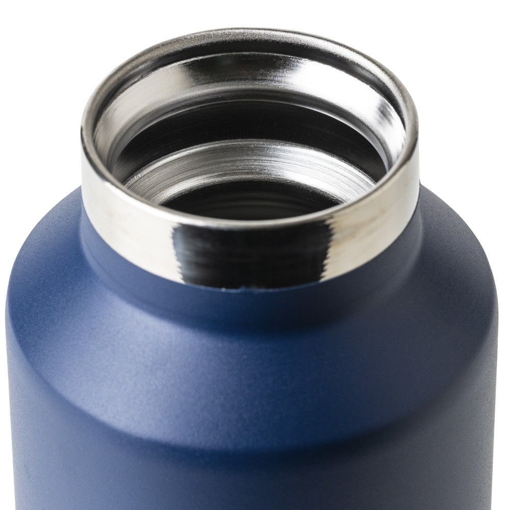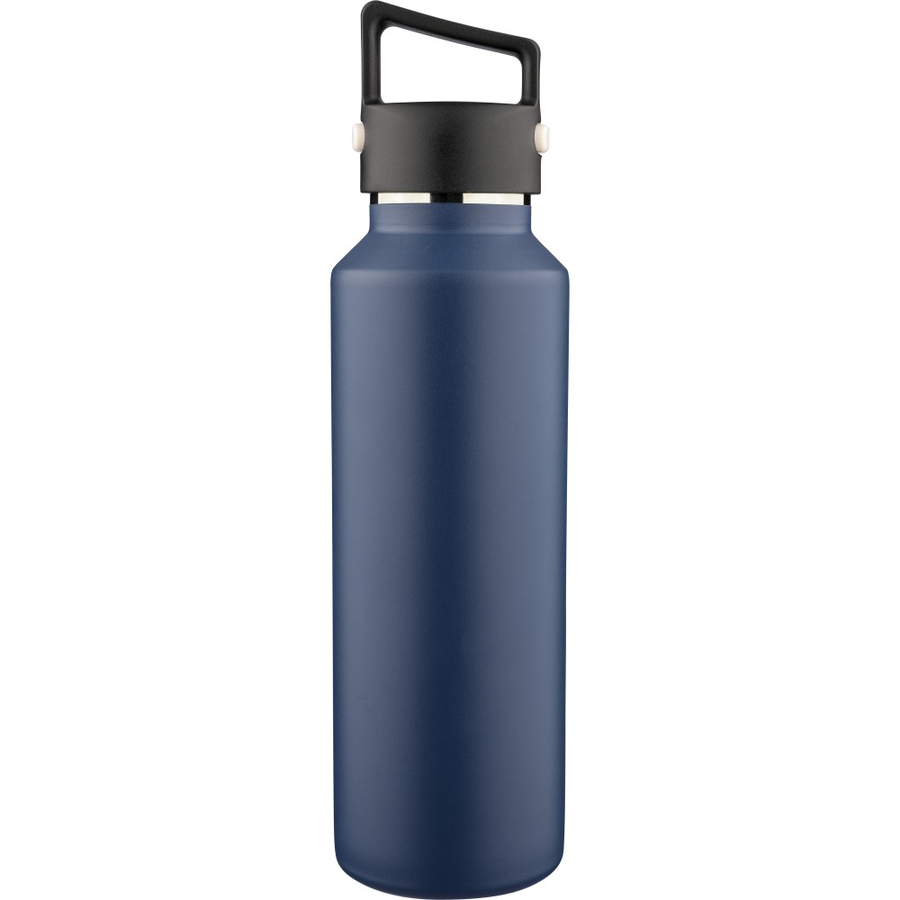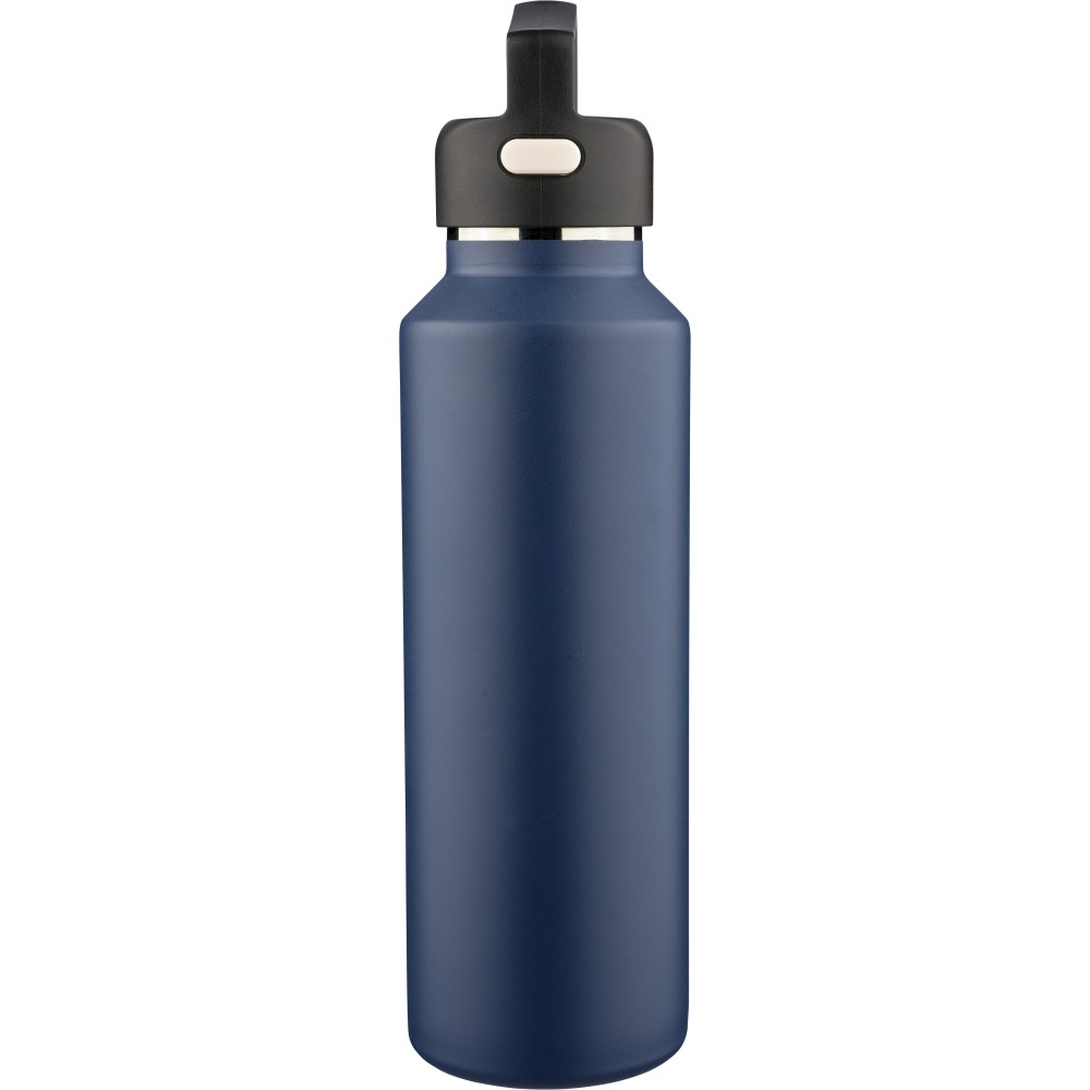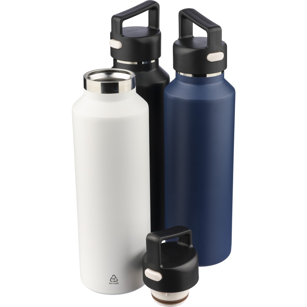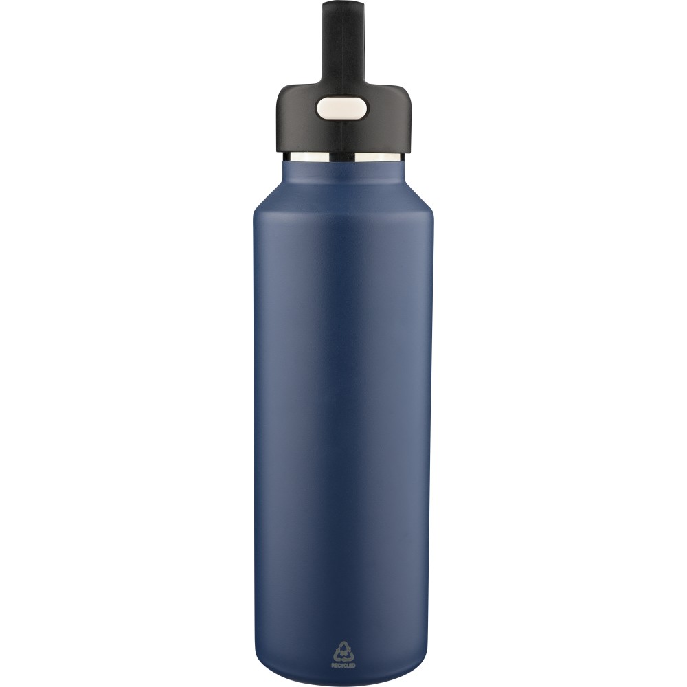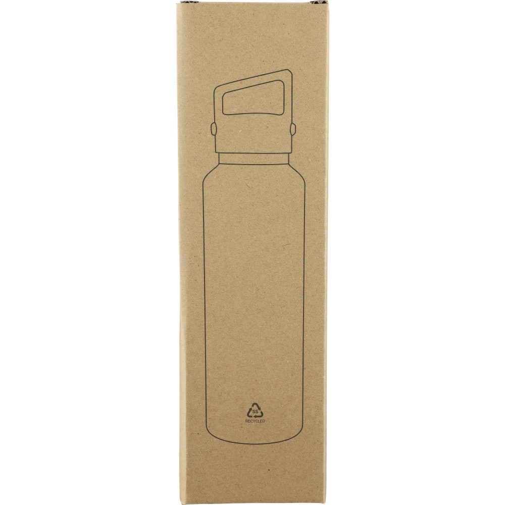 Recycled stainless steel vacuum bottle (600 ml) with double-wall construction, PP lid with carry loop, dual push-button lid opening, and laser-engraved recycled logo. Packed in a brown cardboard box. [ENG]