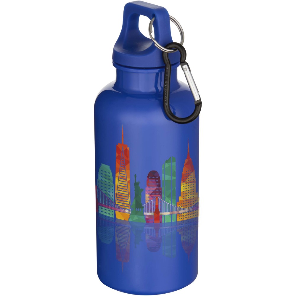Staying hydrated at all times is possible with this durable yet lightweight 400 ml water bottle made from RCS certified recycled PET. It is the perfect companion while exercising, on day trips or at the office. The single-walled Oregon bottle has a twist-on lid and offers plenty of space to add any kind of logo. Clip the attached carabiner (not suitable for climbing) securely to a bag to avoid losing it. Manufactured in compliance with the EFSA approved PET recycling process. [ENG]