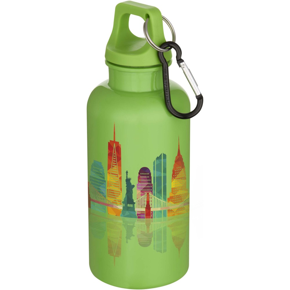 Staying hydrated at all times is possible with this durable yet lightweight 400 ml water bottle made from RCS certified recycled PET. It is the perfect companion while exercising, on day trips or at the office. The single-walled Oregon bottle has a twist-on lid and offers plenty of space to add any kind of logo. Clip the attached carabiner (not suitable for climbing) securely to a bag to avoid losing it. Manufactured in compliance with the EFSA approved PET recycling process. [ENG]