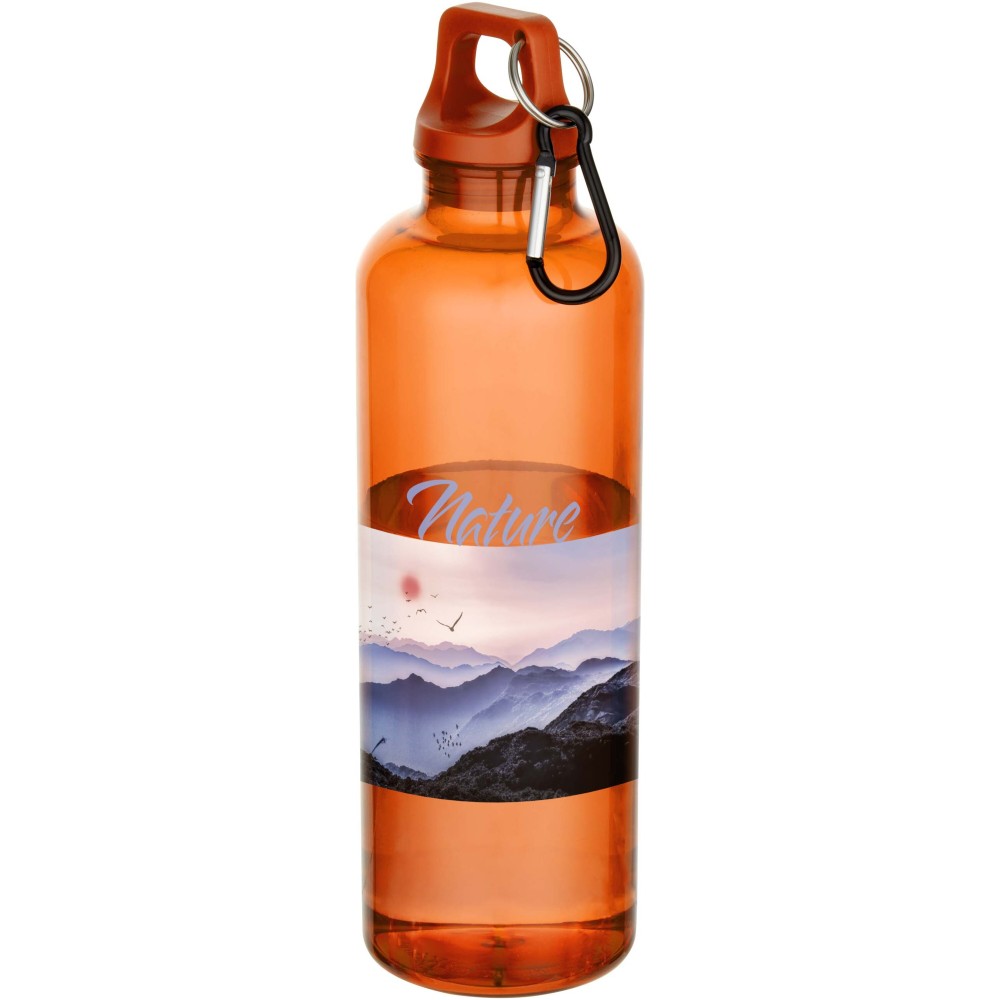 Staying hydrated at all times is possible with this durable yet lightweight 750 ml water bottle made from RCS certified RPET. It is the perfect companion while exercising, on day trips or at the office. The single-walled Oregon bottle has a twist-on lid and offers plenty of space to add any kind of logo. Clip the attached carabiner (not suitable for climbing) securely to a bag to avoid losing it. In compliance with the EFSA approved PET recycling process. [ENG]