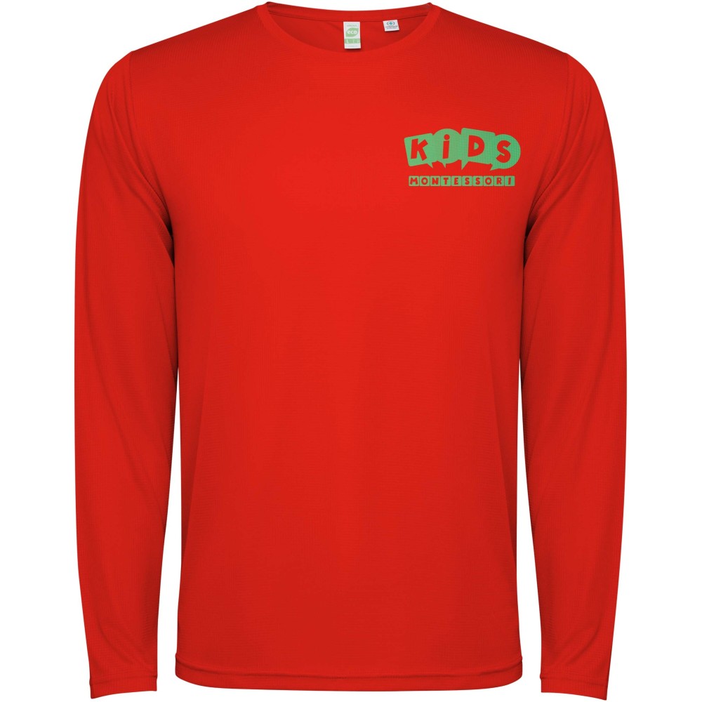 Kids long-sleeve unisex technical t-shirt. Collar with matching seams. Back hem slightly longer than the front. Side seams shifted forward. [ENG] Logodruck: Stickerei, Siebdruck