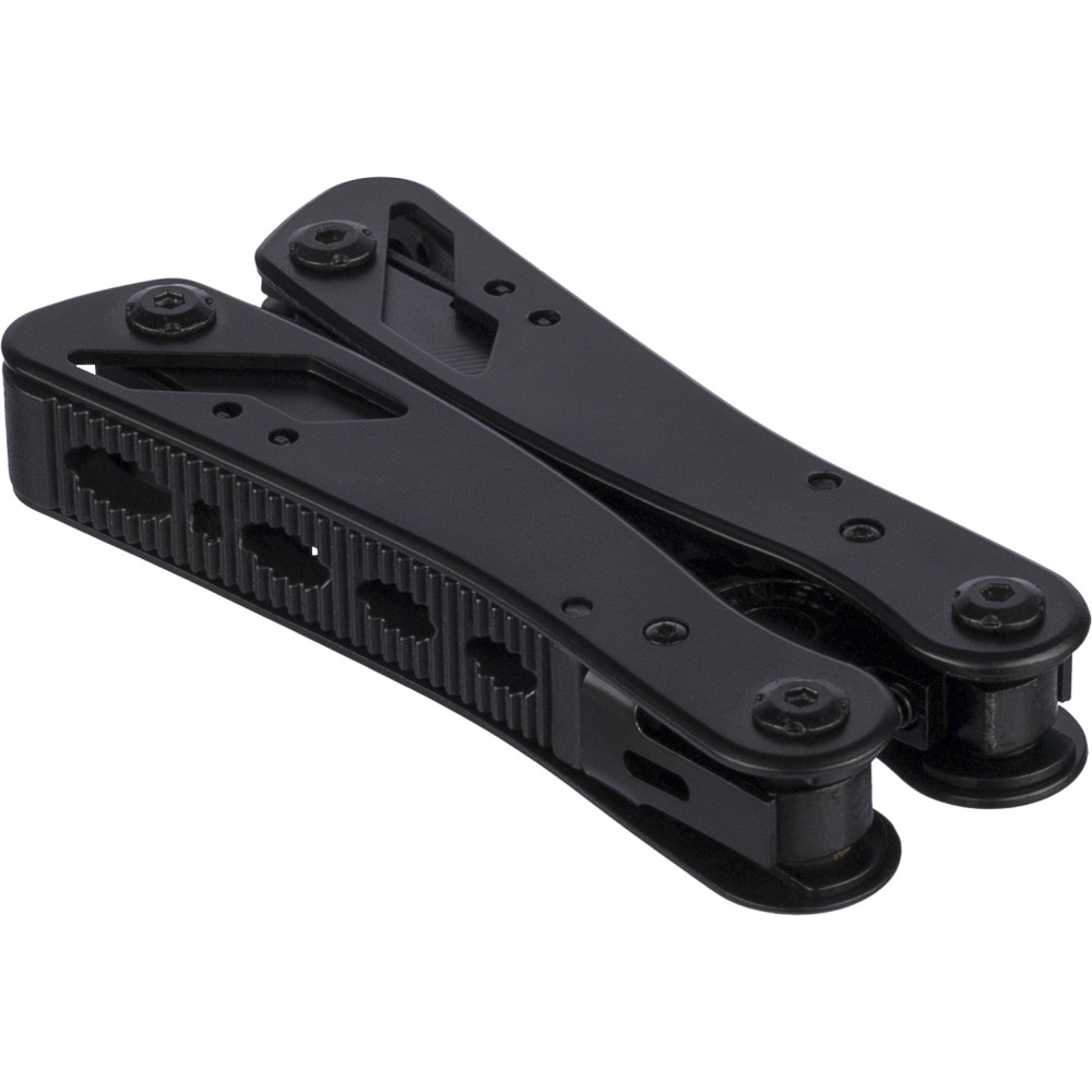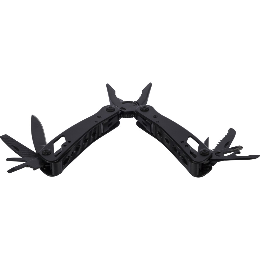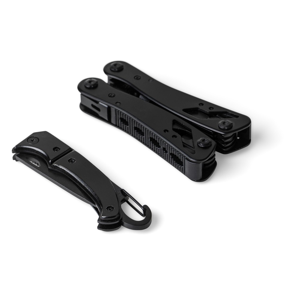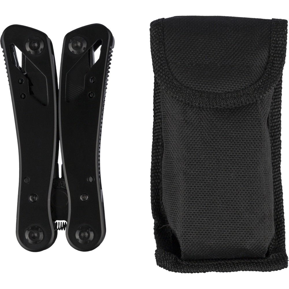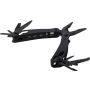 Black aluminium and stainless steel multitool with 13 functions including knives, screwdrivers, pliers, saw, file, lever, bits, spring, loop bar, can opener, and tang. Comes with a pouch featuring a velcro belt loop and additional outer box. Individually packaged in a brown cardboard box. [ENG]