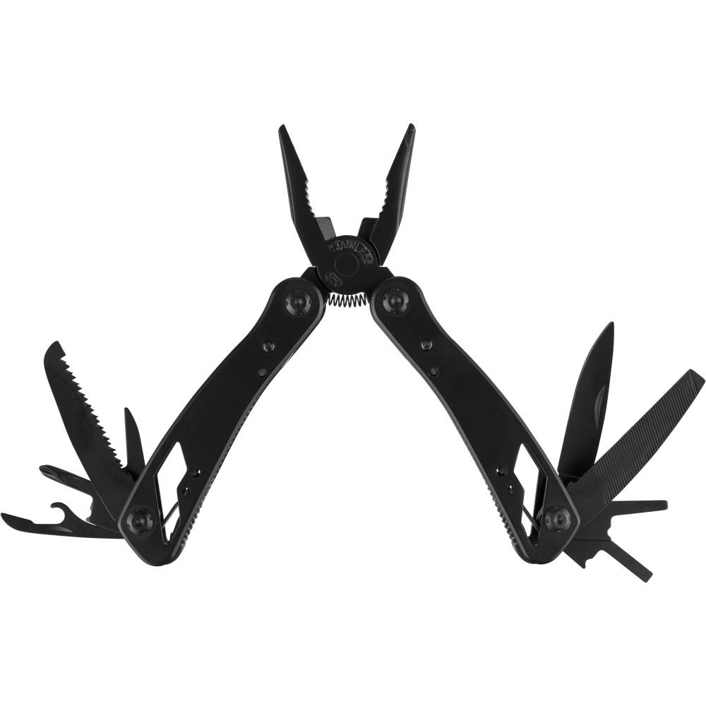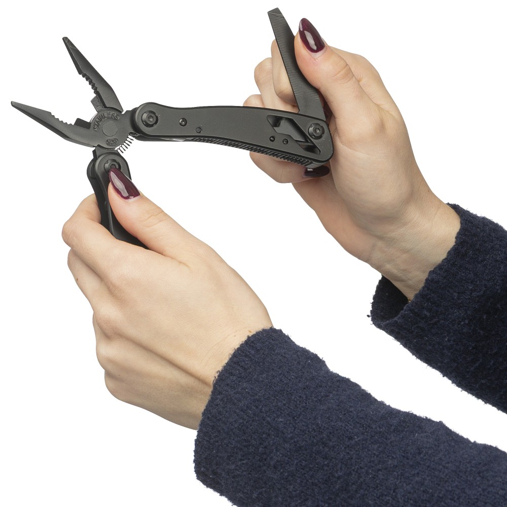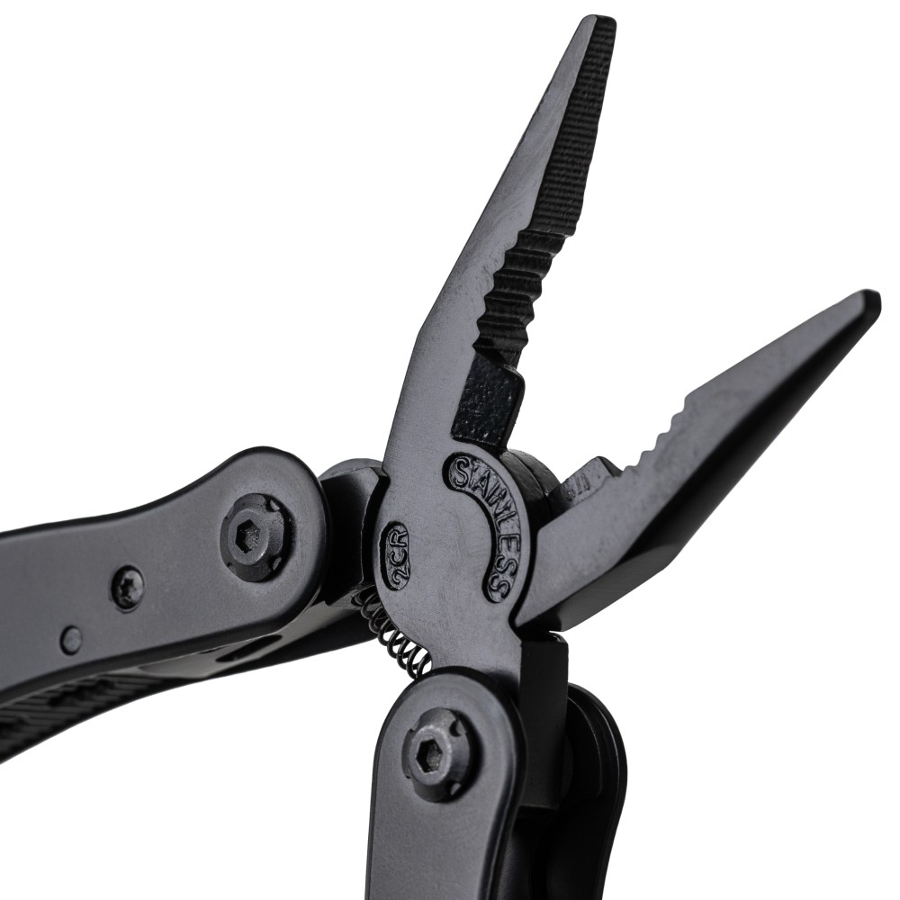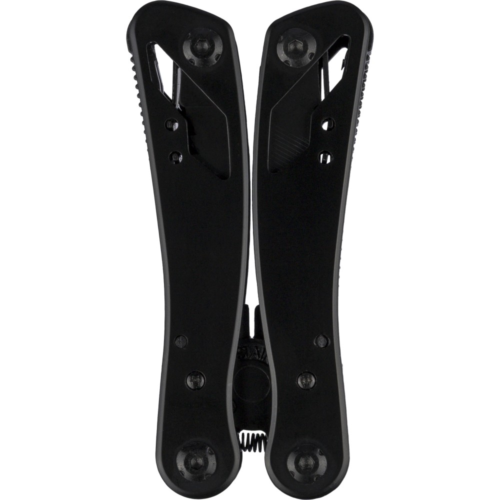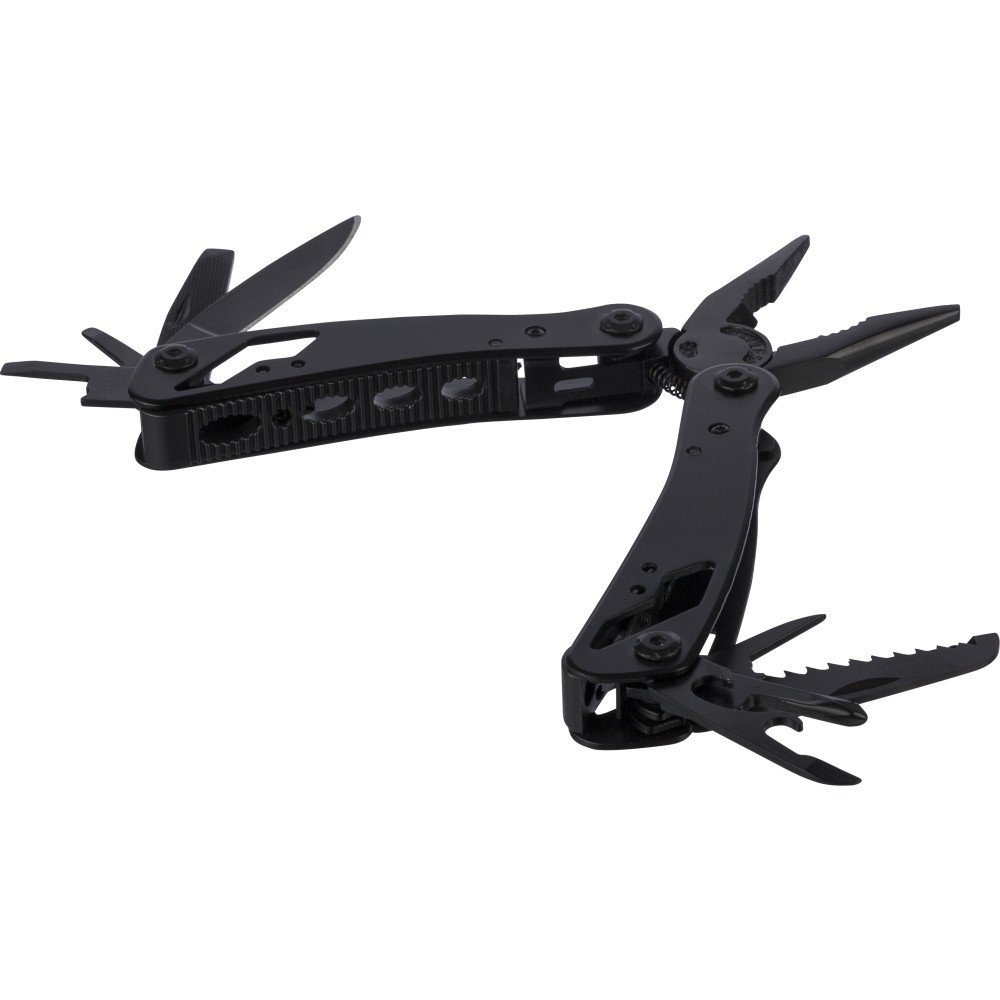 Black aluminium and stainless steel multitool with 13 functions including knives, screwdrivers, pliers, saw, file, lever, bits, spring, loop bar, can opener, and tang. Comes with a pouch featuring a velcro belt loop and additional outer box. Individually packaged in a brown cardboard box. [ENG]